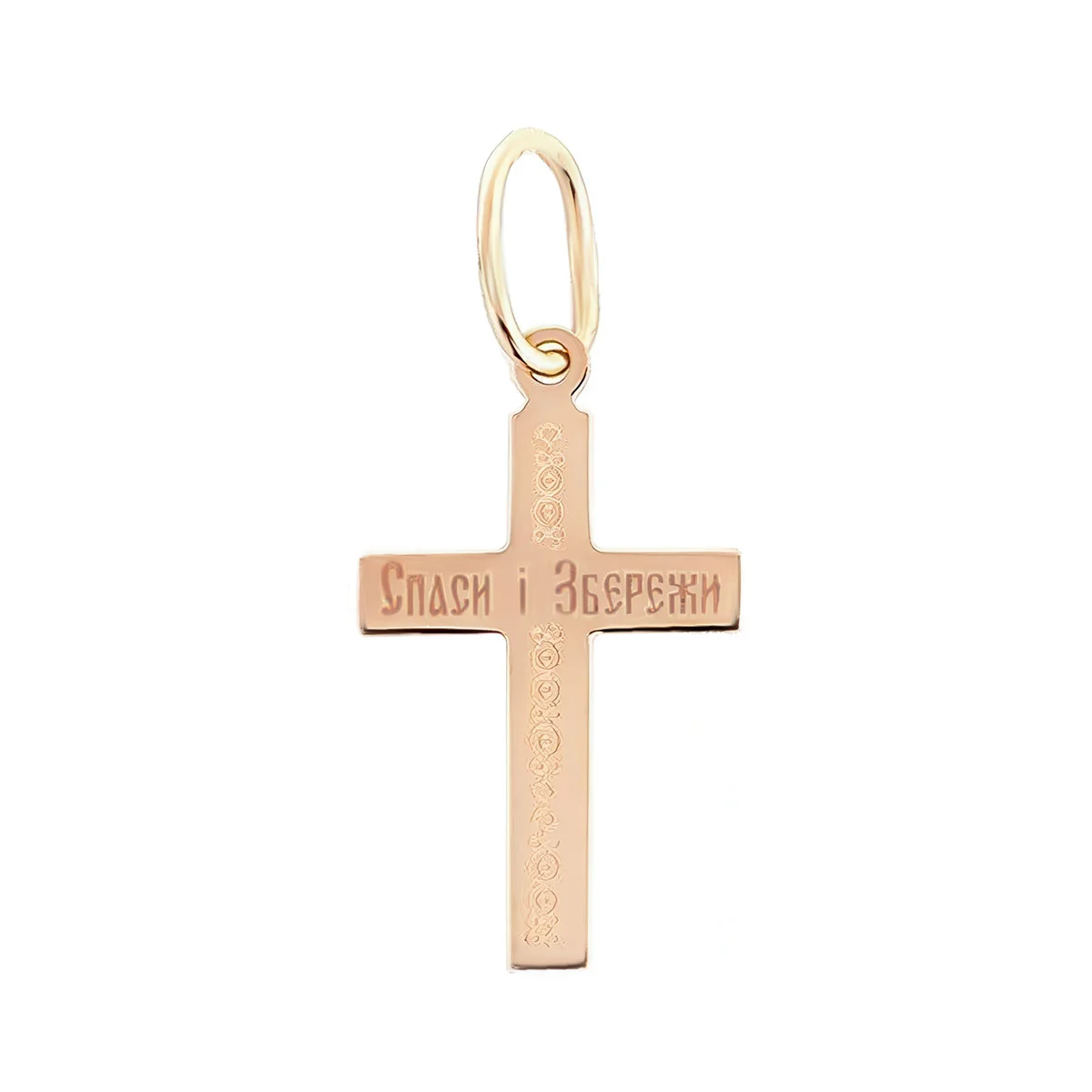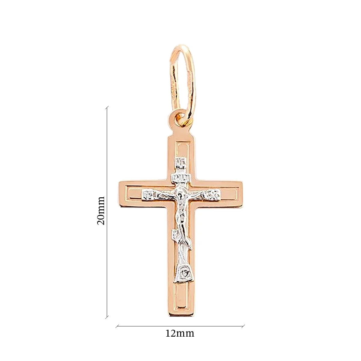Крестик из комбинированного золота привлекает внимание лаконичным дизайном и небольшим размером, поэтому подойдет детям или подросткам. Прямые края, четырехконечная форма, красивое сочетание оттенков – вот его составляющие. Сам крест выполнен из красно-желтого золота 585 пробы, а распятие – из белого. По краю проходит декоративное очертание распятия тонкой линией, а на обратной стороне – небольшая гравировка символов и надписи – «Спаси и сохрани», что свидетельствует о его предназначении для православных. Подвесное ушко - в виде изящного кольца. Этот отличный подарок на крестины или день рождения.