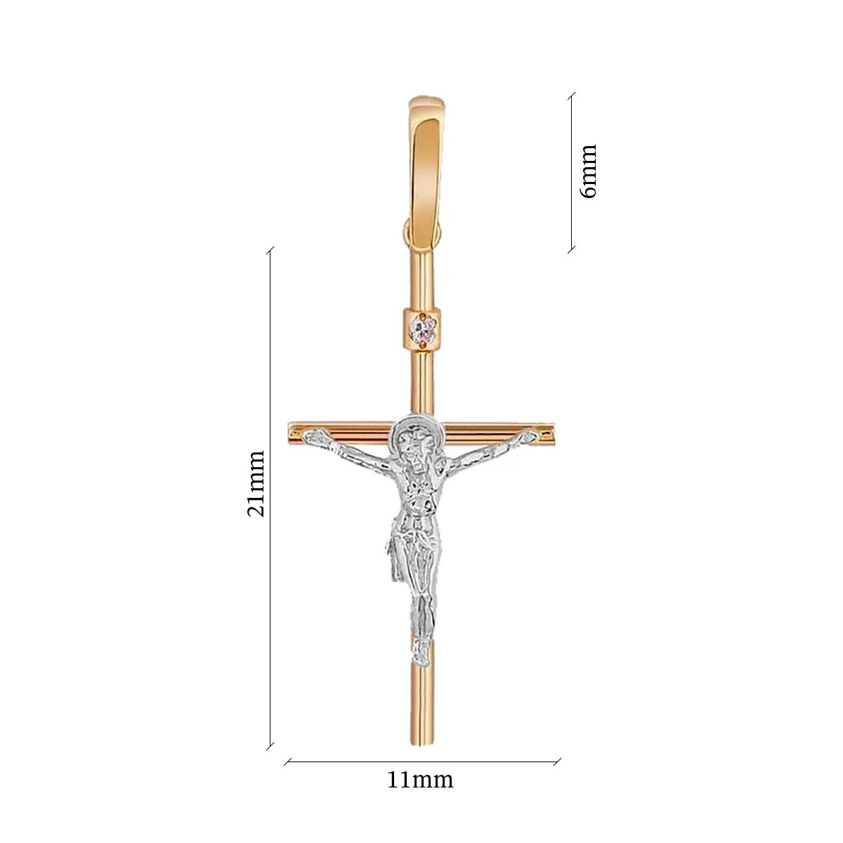 Изящный и утонченный крестик из комбинированного золота с бриллиантом станет оберегом и вместе с этим изысканным ценным украшением. Для изготовления использовано белое и красное золото. Форма распятия соответствует католическим канонам, изделие подойдет для обряда крещения и носки в качестве религиозного оберега, символа веры. Украшение имеет классический дизайн, подходит для любого пола и возраста. Благодаря высочайшему качеству материалов оптимально для постоянной носки 一 сохраняет первозданный вид в течение многих лет эксплуатации.