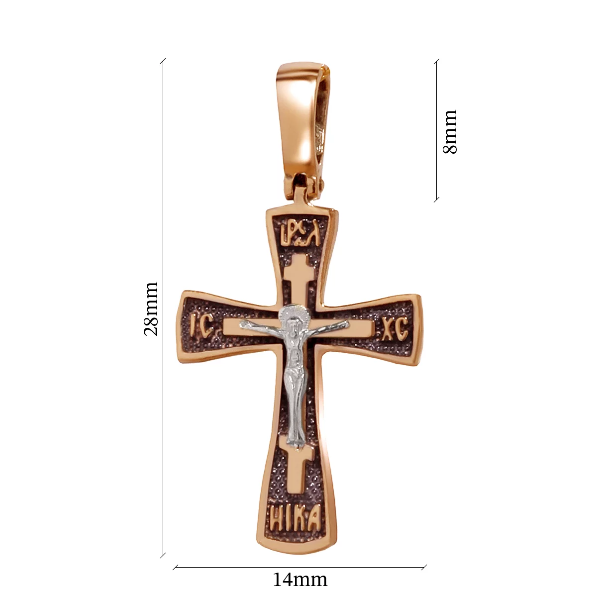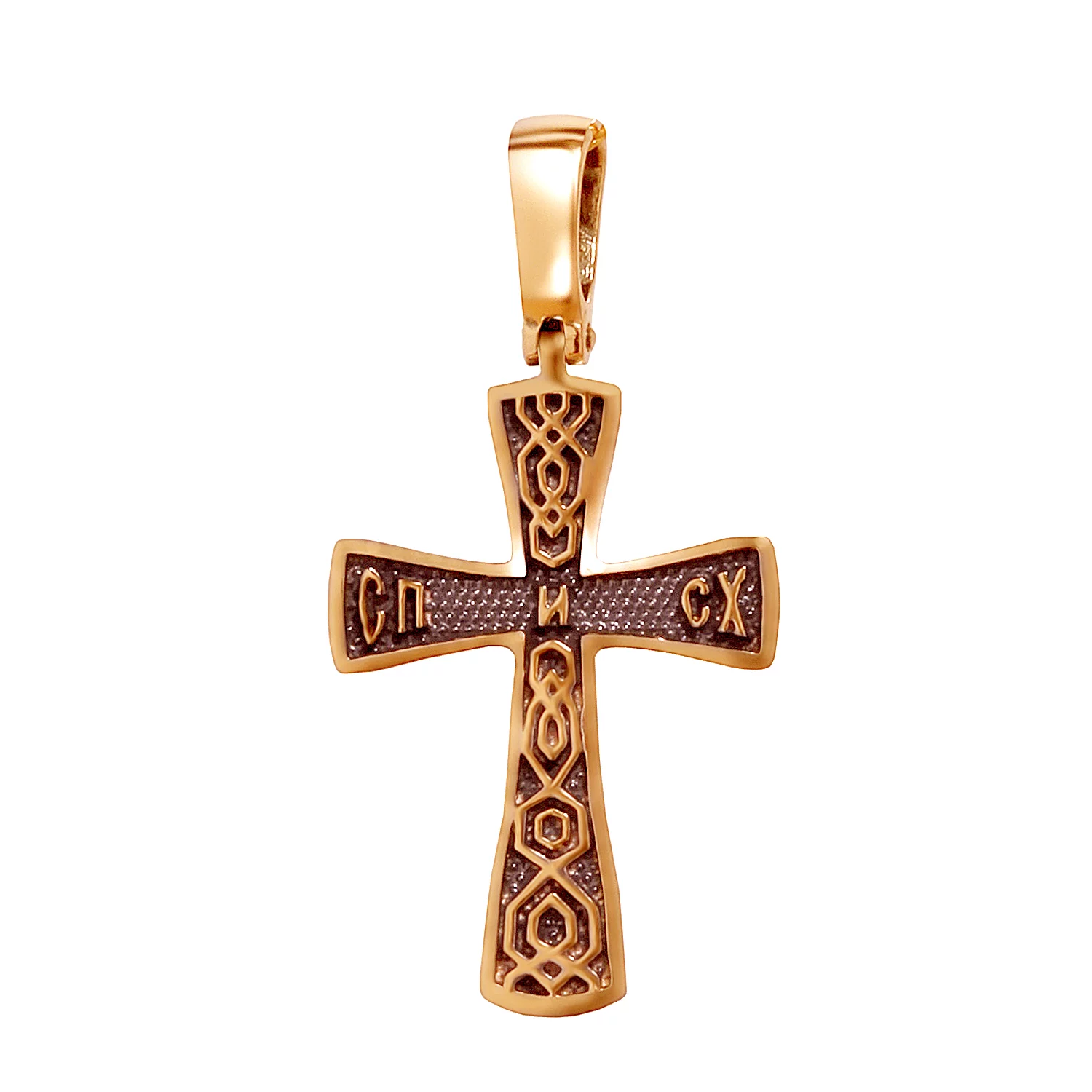 Четырехконечный крест из красного золота с чернением. Металл отличается стойкостью к деформациям и гипоаллергенностью. В центре украшения расположена фигура Иисуса Христа на кресте. На каждом конце символа веры ювелирной резьбой высечены надписи в виде сокращений: «Иисус», «Христос», «Царь Славы», «Победа». На обратной стороне нательного крестика виднеются элегантные узоры с фразой «Спаси и Сохрани». Дизайн христианского украшения позволяет носить его и мужчинам, и женщинам, сочетая с другими ювелирными изделиями.