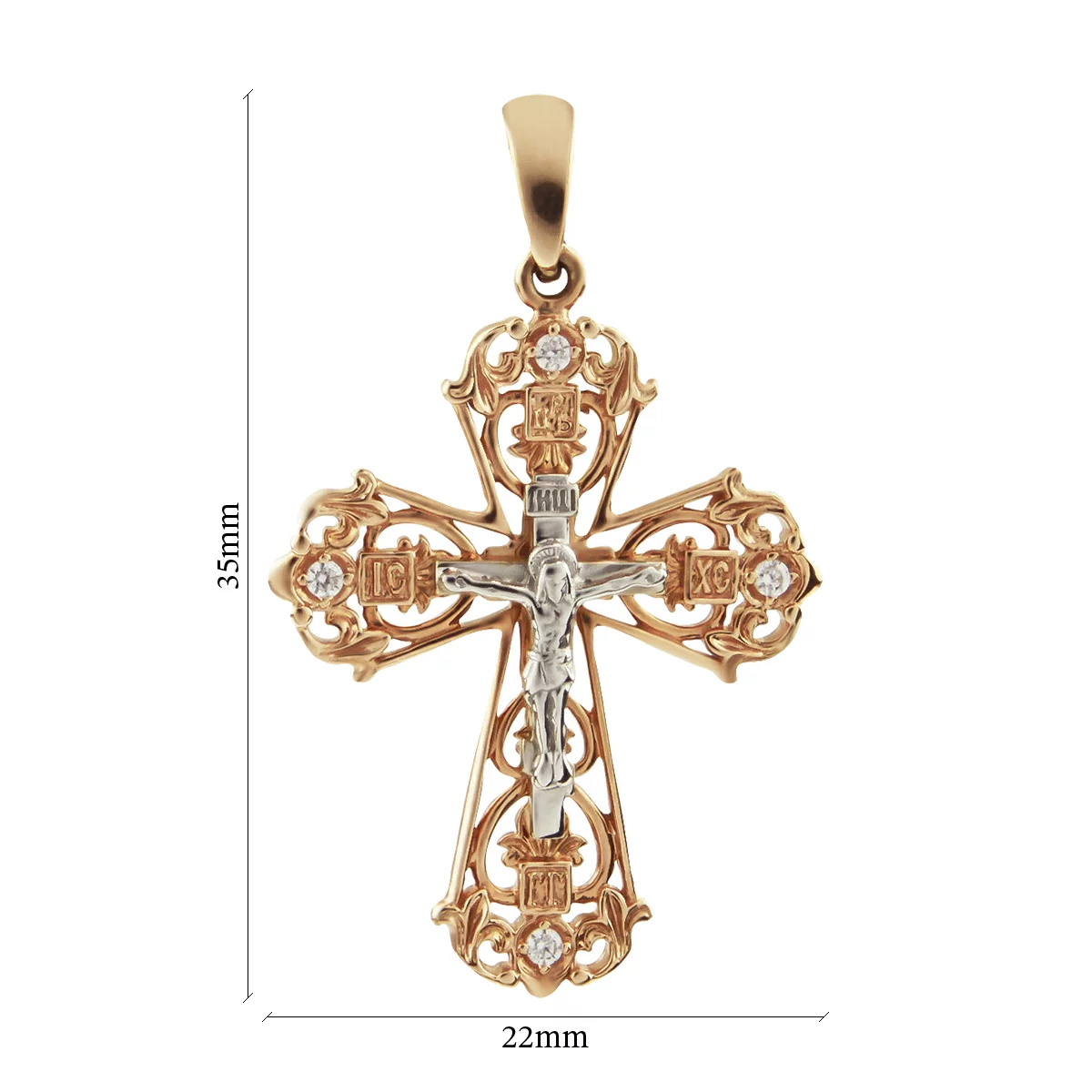 Крестик "Иисус Христос" в комбинированном золоте с эмалью и фианитами - 1951075