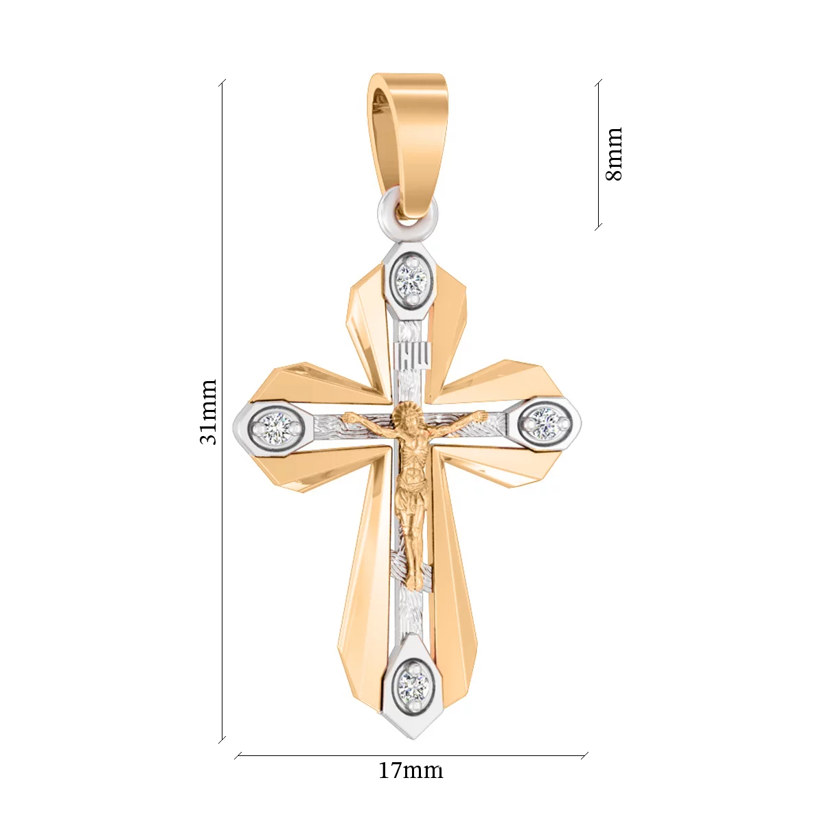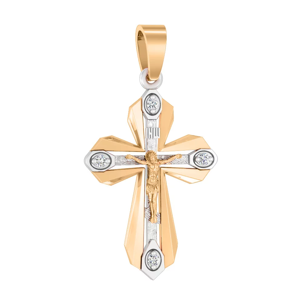 Крестик из комбинированного золота с циркониями — дизайнерская комбинация с гармоничностью сочетания каждой детали. В этой композиции блеск белого и красного металла с сиянием драгоценных камней не диссонирует, а эффектно играет. Красное обрамление изделия восходит к распятию, а белый фон — с четырьмя массивными камнями, расположенными по краям. Привлекают и плавные линии форм с заостренными углами. Несмотря на яркий дизайн, сразу привлекающий внимание, изделие является универсальным для разных поводов. Украшение придаст повседневности немного красок, но не потеряется на фоне роскошного наряда