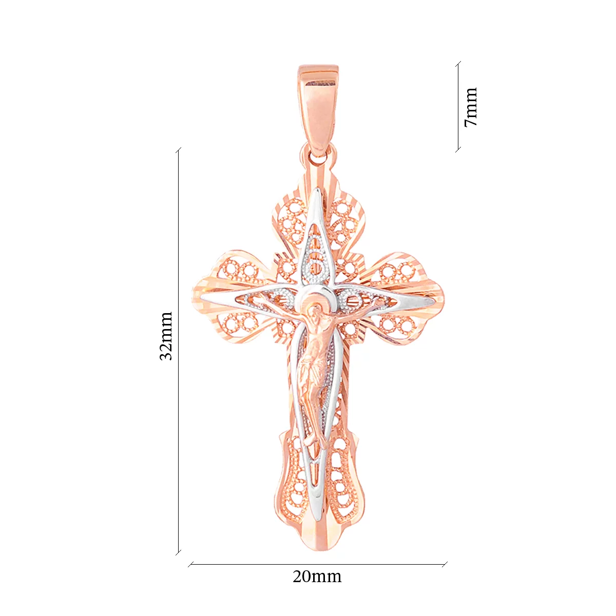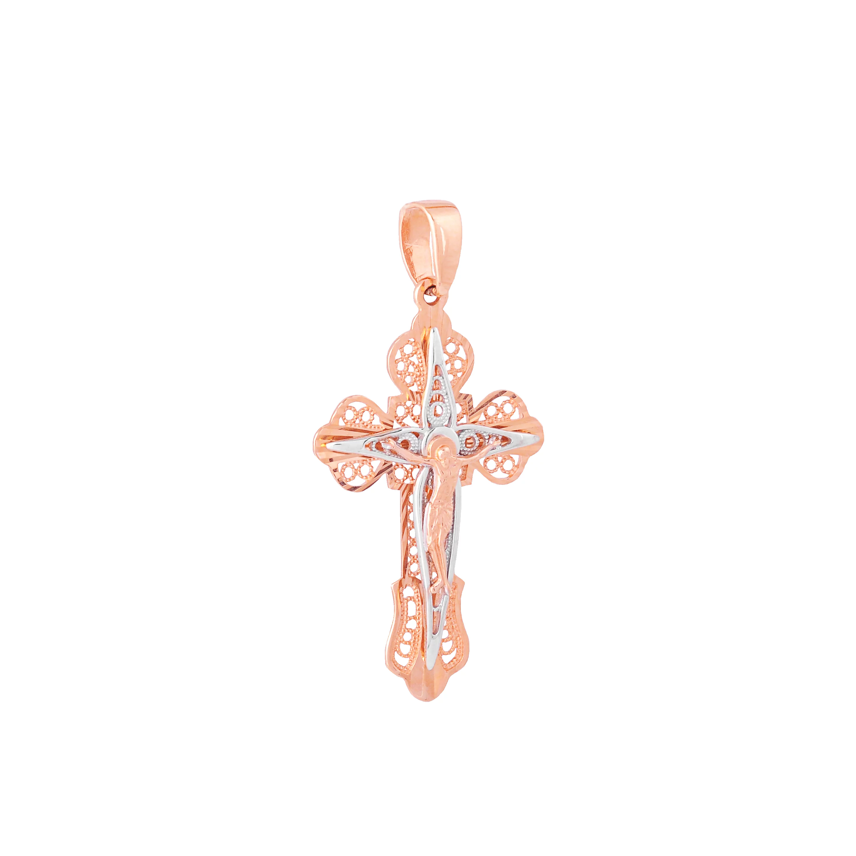 Необычный орнаментальный узор и изысканная резьба делают крестик из красного и белого золота оригинальным и роскошным образцом ювелирного искусства. Изготовлен крестик из драгоценного металла 585 пробы. Утонченная гравировка из красного золота напоминает причудливое ожерелье, которое повторяет силуэт крестообразной формы изделия, выполненного в форме трилистника. В центре изысканной ювелирной композиции — распятие, изготовленное из белого золота и расположенное на кресте, который имеет необычную форму, напоминающую вифлеемскую звезду.