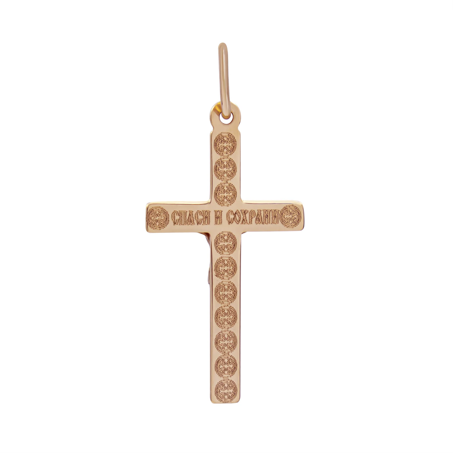 Изысканный православный нательный крестик с распятием выполнен из красного золота 585 пробы. Его нежное сияние будет по душе как мужчинам, так и женщинам. Крестик также можно купить ребенку на крещение или в качестве подарка. Правильная геометрическая форма изделия делает его лаконичным и уместным для любителей разных стилевых решений. Крестик украшен узорами, расположенными над руками, головой и у ног Христа. На обратной стороне сделана надпись «Спаси и сохрани», а также религиозные символические узоры по всей длине. Кольцо-подвесное ушко – максимально надежное.