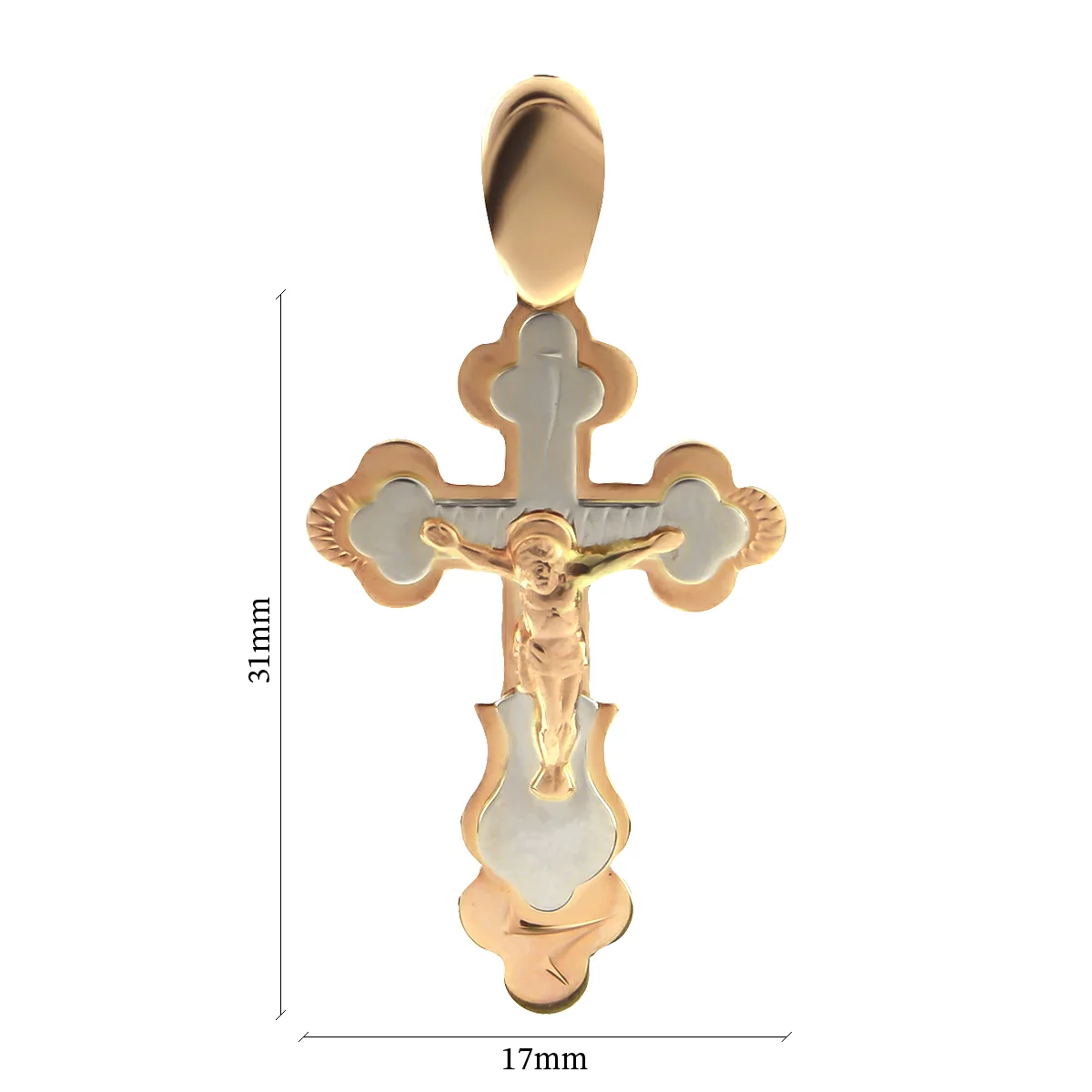 Крестик из красного золота отличается универсальностью – он украсит бюст хрупкой девушки, мужчины не крупного телосложения и отлично подойдёт малышу для крещения. Изображение Иисуса с медным отливом имеет мягкие, плавные края, которые оттеняются вставками из белого золота. Изделие гармонично смотрится на цепочке из аналогичного материала панцирного плетения или Бисмарк. Выбирая крестик в качестве подарка на День рождения стоит учитывать его сочетаемость с цепочкой именинника или же дарить полноценный ювелирный комплект.
