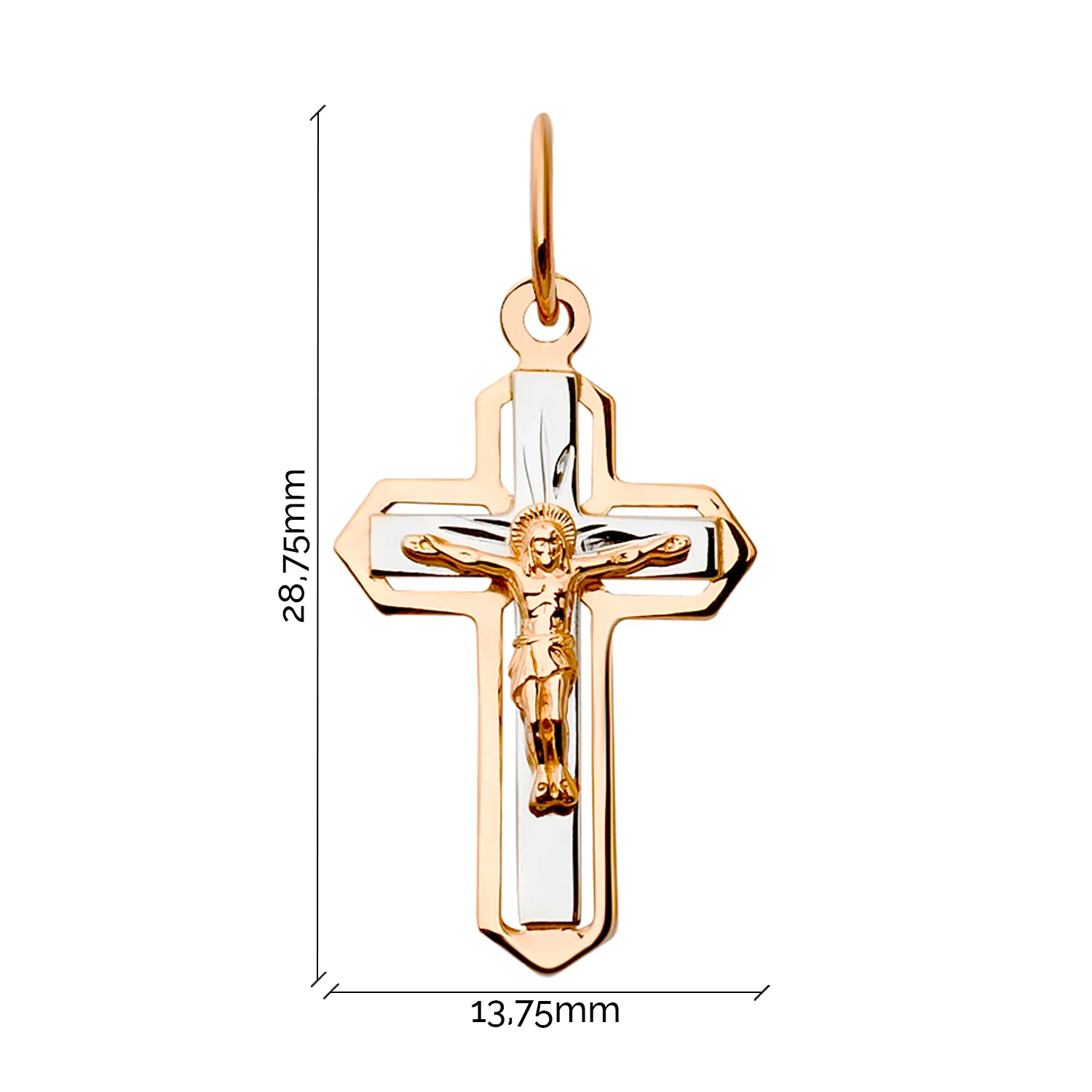 Крестик из красного и белого золота 585 пробы дополнено распятием, символизирующем самопожертвование Иисуса Христа. Он отдал жизнь ради спасения человечества. Латинский крест означает единство Троицы — Отца, Сына и Святого Духа. Сияние вокруг головы Спасителя олицетворяет его божественность. Универсальный дизайн позволяет комбинировать украшение с другими драгоценностями. Ювелирное изделие подойдет в качестве подарка как женщинам, так и мужчинам любого возраста. Преподнести крестик можно близкому человеку по случаю рождения ребенка или крестин.