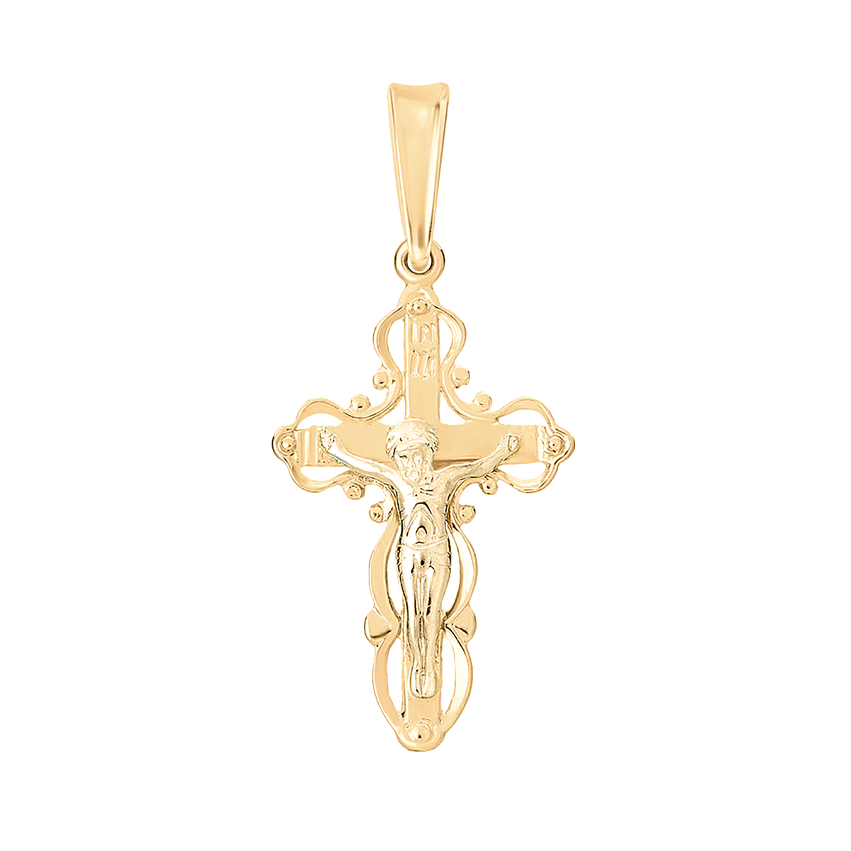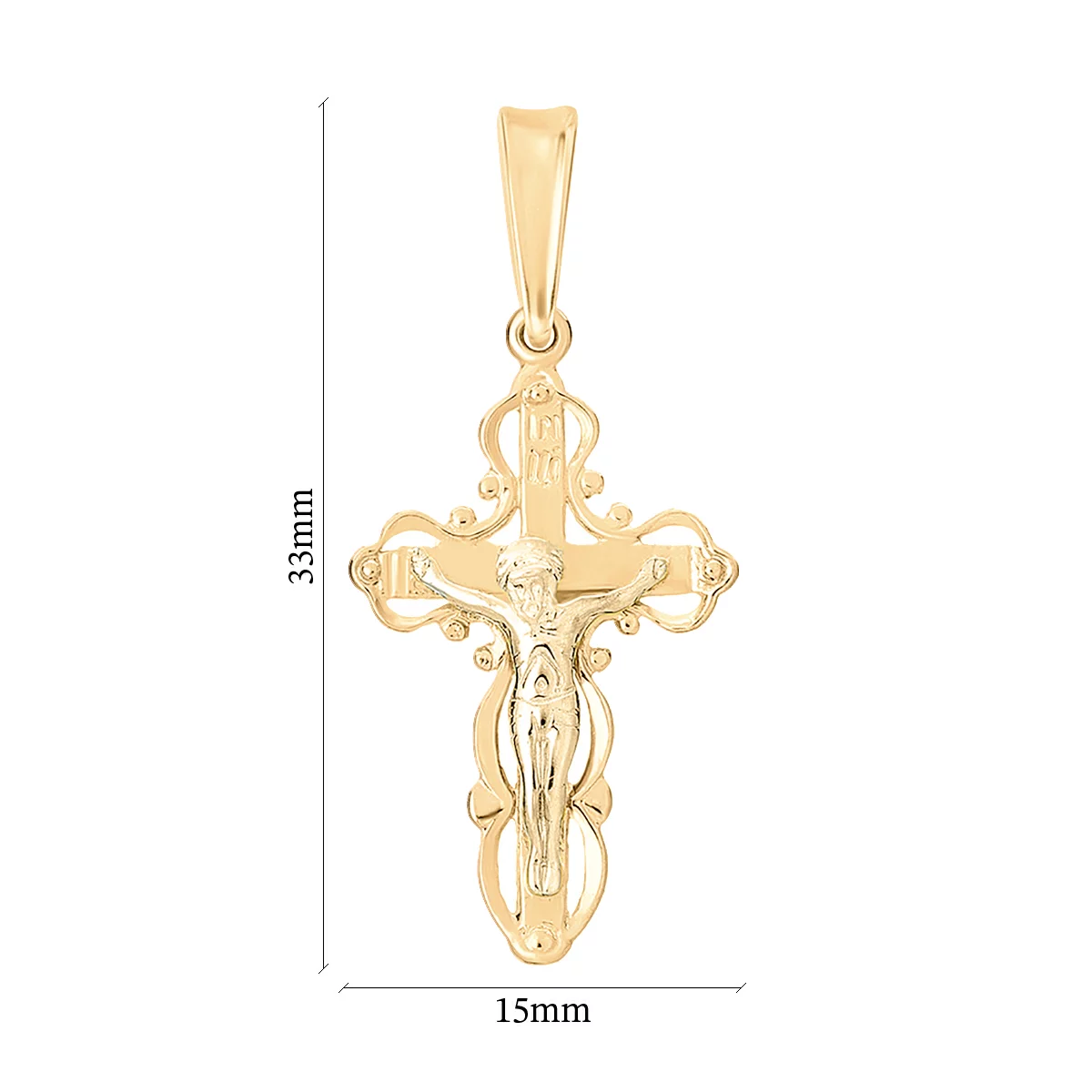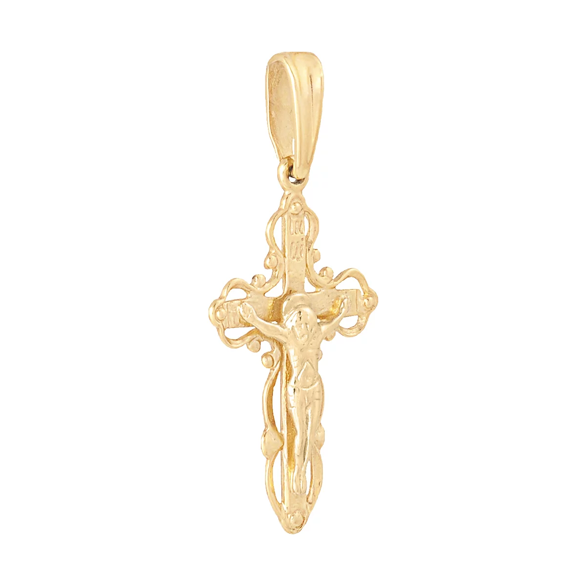 Стильный крестик унисекс из лимонного золота. Украшение с дизайнерским оформлением, его грани с фантазийными мотивами. Основа ювелирного изделия — сплав лимонного оттенка 585 пробы. Он состоит на 58,5% из золота, остальное — лигатурные примеси. Они повышают прочность, крепость, улучшают другие физико-химические характеристики. В центре композиции фигурное распятие. Крестик выглядит элегантно, подойдет для повседневного ношения. Его можно приобрести в качестве подарка к Новому году, дню рождения, юбилею, другому торжеству.