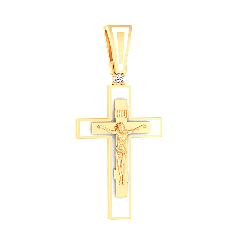 Крестик из желтого золота с фианитом и эмалью - 1534847