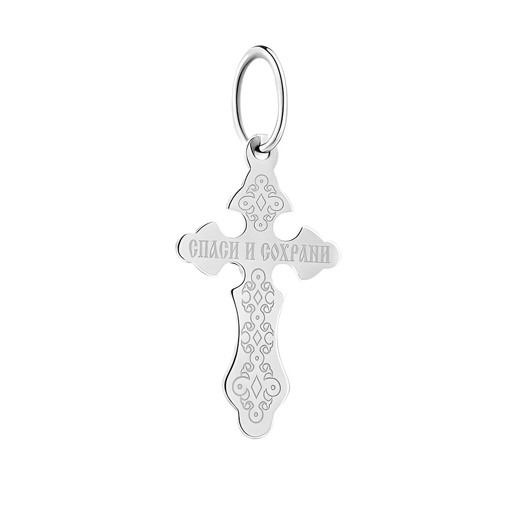 Серебряный крестик — универсальное украшение, которое подходит под любой тип внешности и стильно сочетается с другими аксессуарами, драгоценными камнями и металлами. Благородный белый блеск самодостаточен и без различных дополнений, что демонстрируется данным украшением. Искусно выполненное распятие и игра фактур — беспроигрышные приемы для выражения красоты качественного серебра. Объемные узоры, которые выступают будто продолжением распятия, эстетично завершают оформление. Тыльная сторона изделия дополнена надписью-оберегом и орнаментом.