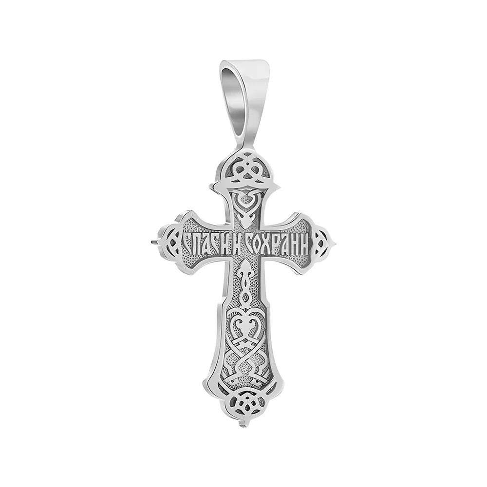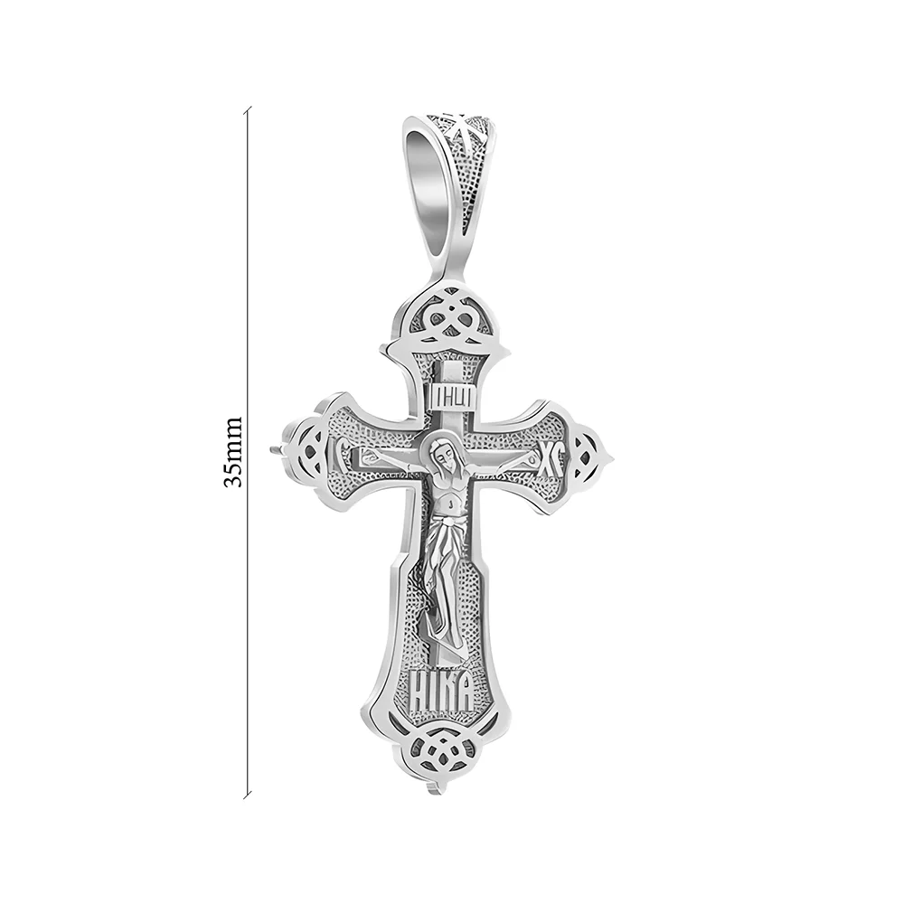 Крестик изготовлен из серебра 925 пробы. Устойчив к деформации и потемнению. Светлый сплав нейтральный, изделие выполнено согласно православным канонам и обращает первостепенное внимание на глубокий смысл христианского символа. Распятый Господь и надписи подчеркивают основную идею. Ажурный орнамент и фигурные края делают его красивым. Большое ушко – это продолжение креста, которое также декорировано узорами. Это хороший подарок на крестины или праздник. Крестик станет не просто украшением, а оберегом. Носить его можно на серебряной цепочке классической вязки.