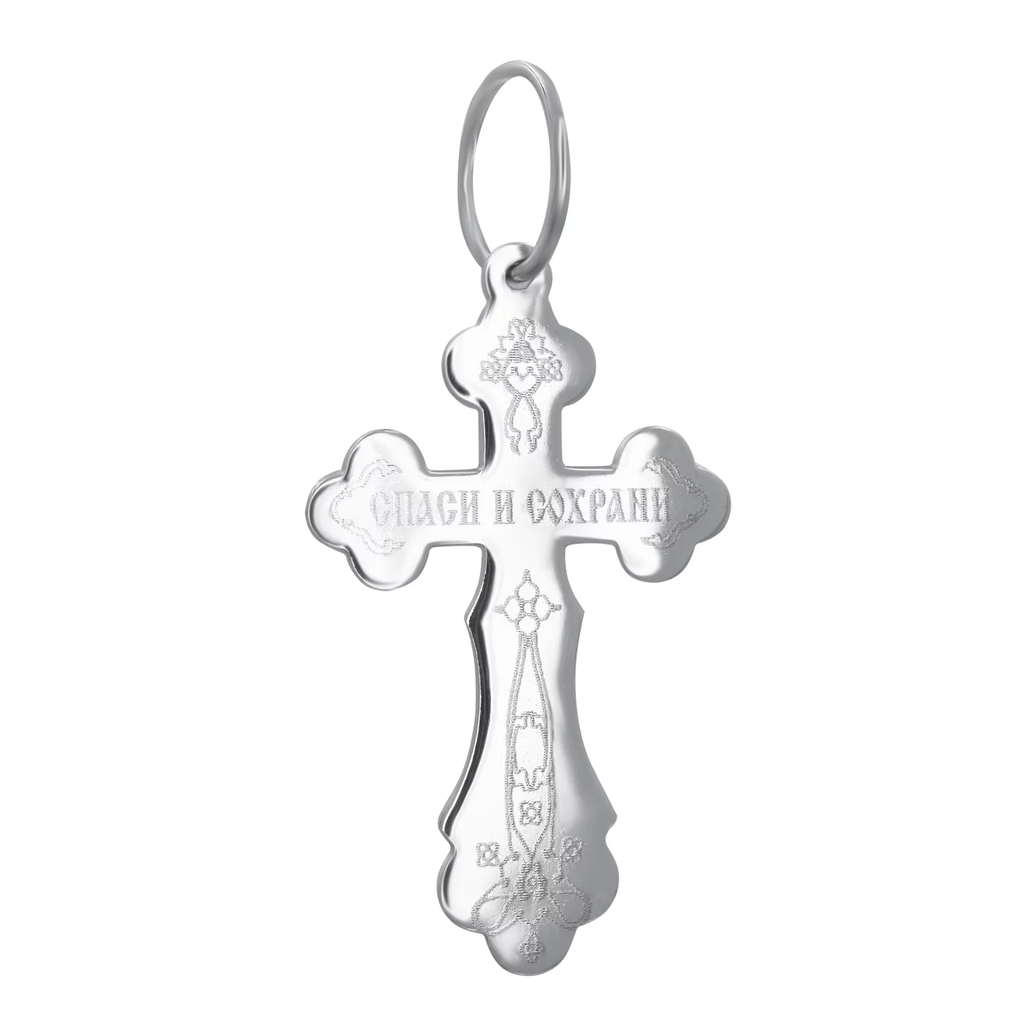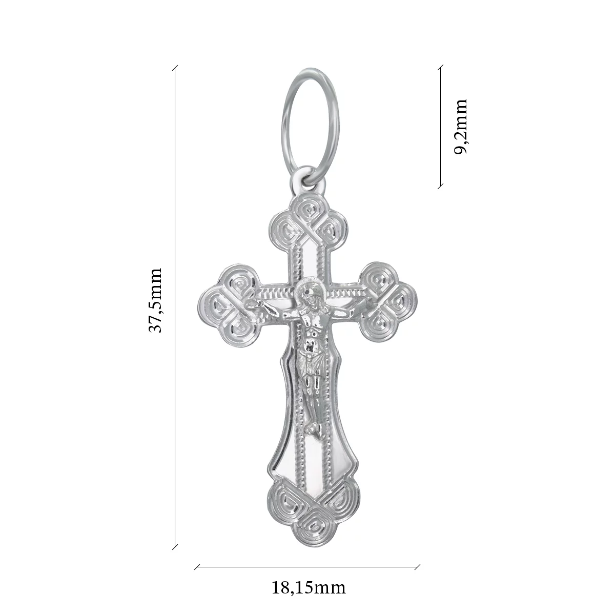 Серебряный крестик — это классика ювелирного искусства. Такое ювелирное украшение является христианским оберегом, именно поэтому многие крестики принято украшать разнообразной резьбой, которая является не просто декоративным украшением, но и имеет символическое значение. Данное изделие также имеет изысканную гравировку, напоминающее контуры знака бесконечности, как символ вечной загробной жизни. Серебряная основа креста имеет форму трилистника. В центре ювелирного изделия — распятие, выделенное фигурной резьбой. Крестик изготовлен из серебра 925 пробы.