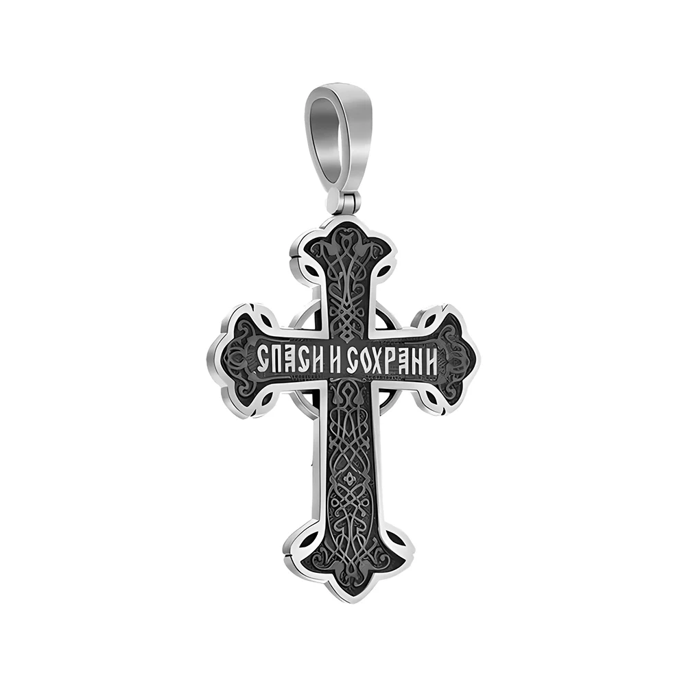 Традиционный православный крестик изготовлен из стерлингового серебра. Белый сплав устойчив к коррозии, долго сохраняет цвет. Техника чернения помогает выделить значимые символические элементы – контур распятия, фигурку Христа и надписи. Благодаря такой обработке изделие выглядит старинным. Христианский атрибут не лишен декоративных элементов. Красиво смотрятся фигурные кончики креста, гравировка на обратной стороне, утолщенное ушко для цепочки. Модель подойдет представителям обоих полов, взрослым и детям. Носить украшение можно на цепочке или шелковом шнуре.