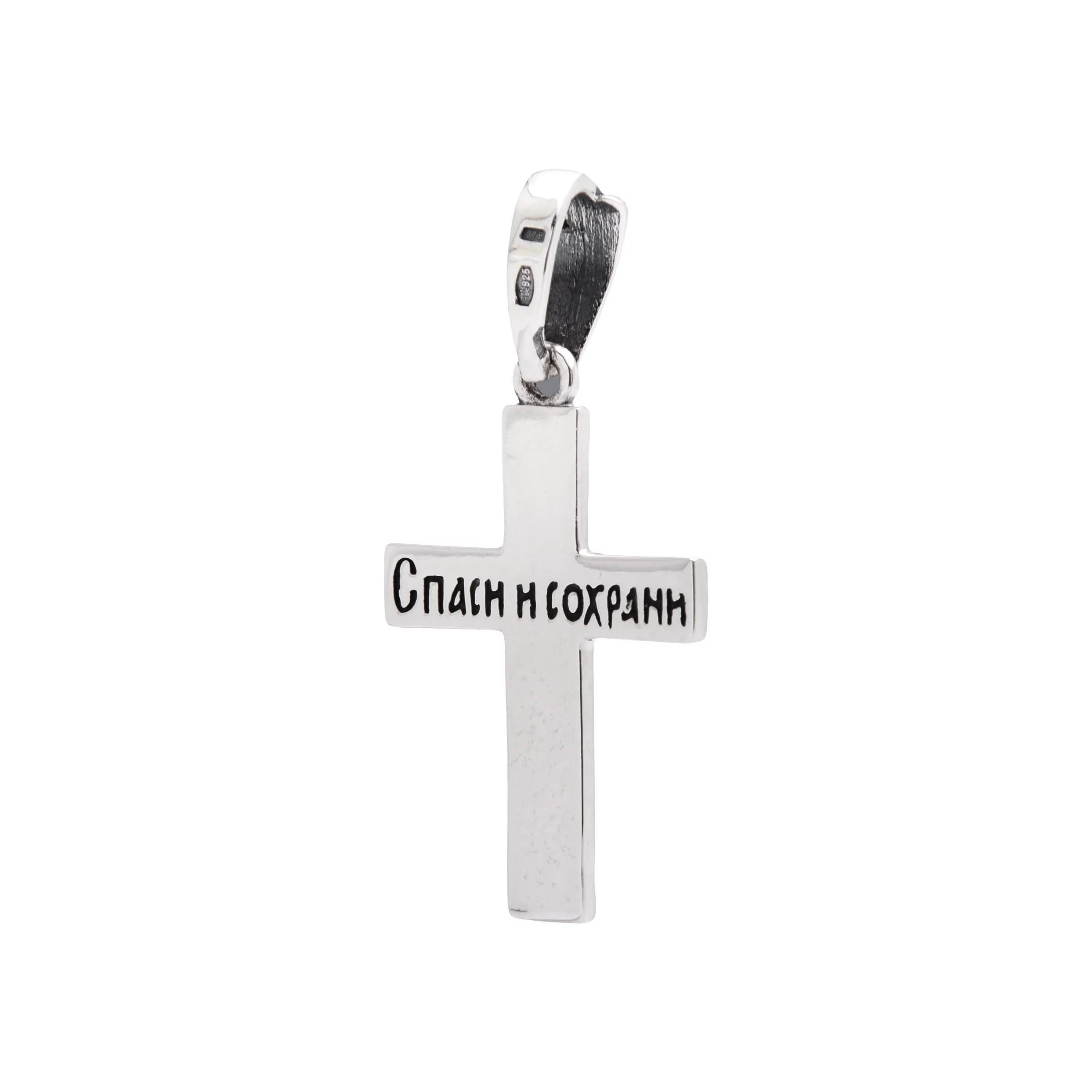 Серебряный крестик с позолотой и чернением — украшение необычайного дизайна, которое привлекает интересных личностей. Стильный прием чернения в данном изделии реализован в насыщенном бархатном цвете, который гармонично сочетается с холодным блеском серебра. Позолота, выполненная на краям украшения, становится своеобразным акцентом, придающим общей картине красок. Объемное распятие на фоне чернения выполнено в немного более светлом оттенке, благодаря чему наблюдается красивая игра цветов. На тыльной стороне изделия размещена надпись-оберег, придающая стильному украшению особого духовного значения.