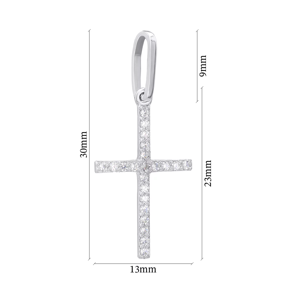 Элегантный декоративный крестик в минималистичном стиле. Его можно носить поверх одежды. Изготовлен из серебра 925 пробы. Вместо распятия изделие украшают 22 небольших циркония. Каждый самоцвет имеет круглую огранку. Благодаря ей драгоценные камни получаются симметричными и хорошо пропускают свет. Закреплены корнеровым методом (посажены в специальные углубления). Фиксация надежная. Практически невесомое, изящное украшение будет хорошо смотреться на любой шее. Просторная петля позволит подобрать любую цепочку.