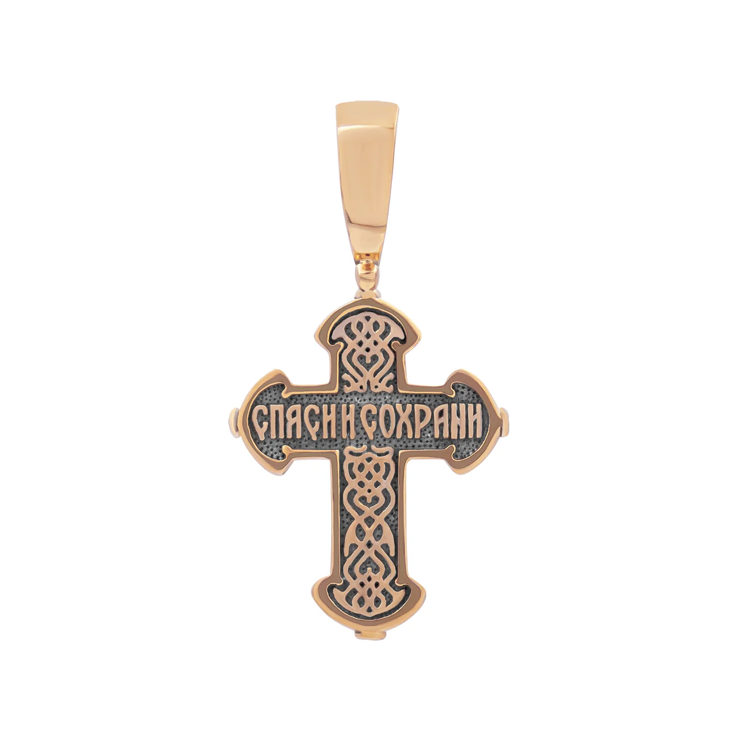 Золотой крестик с чернением — это не просто украшение, а реликвия, которая имеет сакральный смысл для каждого христианина. Крестик изготовлен из драгоценного металла 585 пробы с добавлением чернения, что делает украшение более глубоким и таинственным. Фигурная оправа креста создает золотой ореол вокруг распятия, которое имеет шестигранную форму. На внутренней стороне нательный крестик украшен изысканной гравировкой и дополненный традиционными словами из молитвы «Спаси и сохрани». Крестик станет отличным подарком по случаю дня рождения или в день крестин.