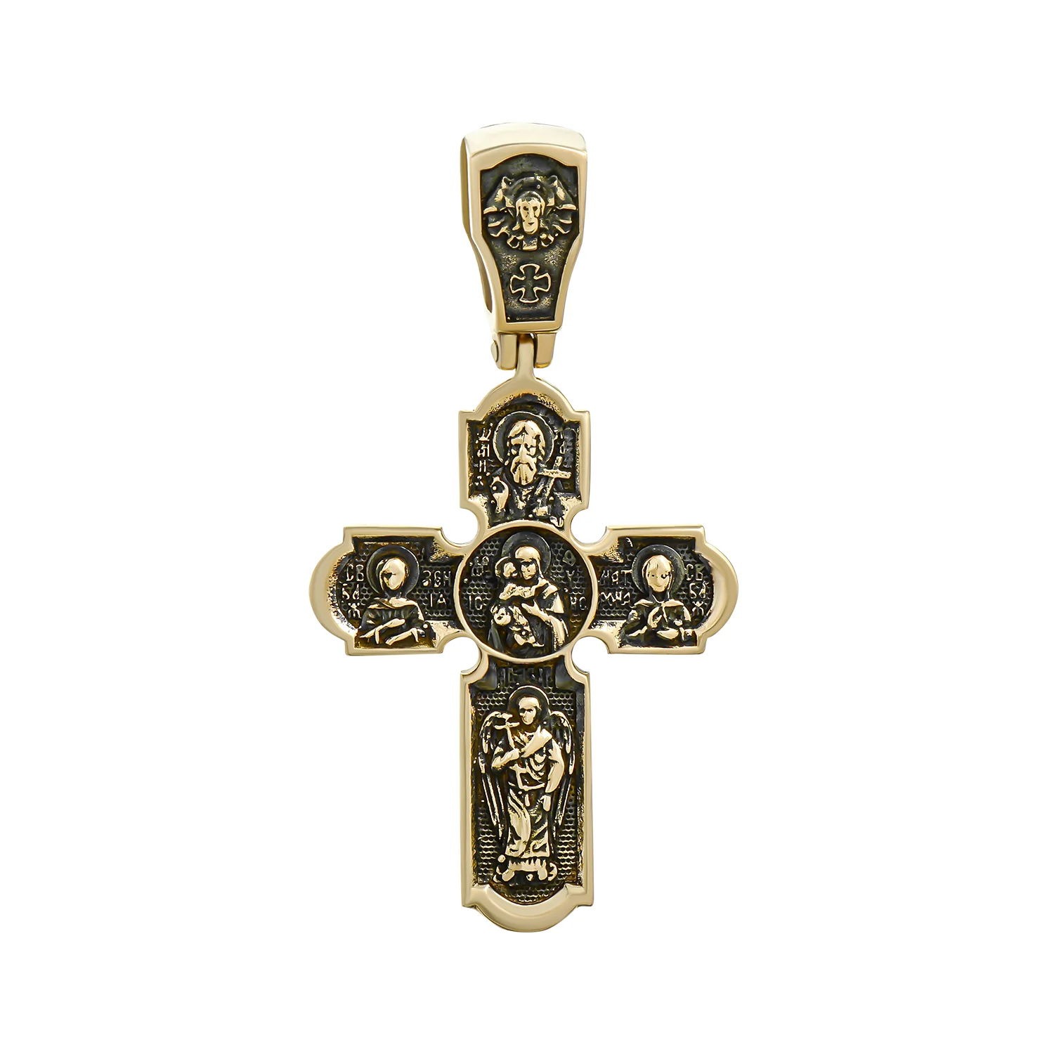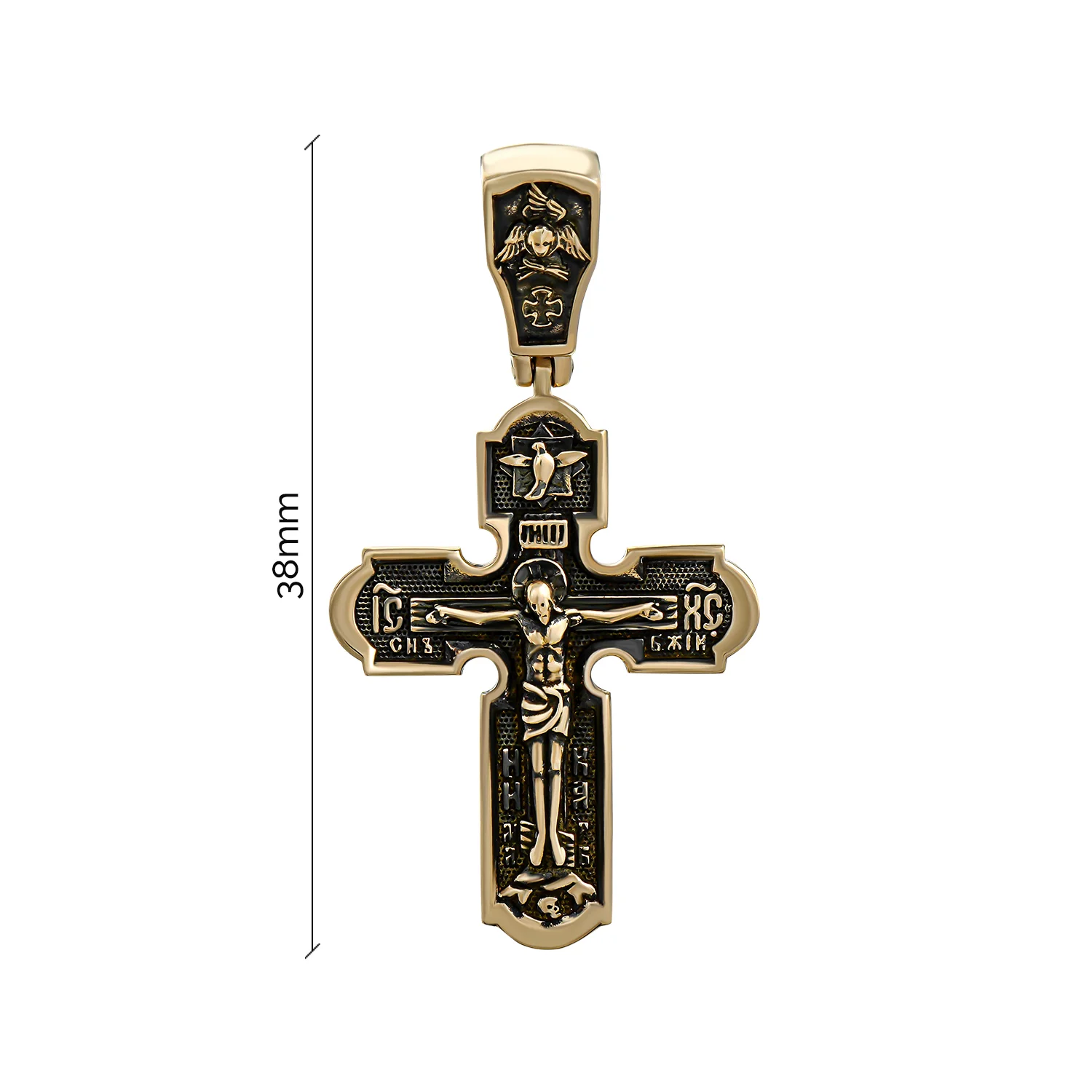 Дизайнерское исполнение крестика соответствует древним православным традициям. Кроме основного изображения Иисуса Христа на лицевой стороне, на обратной есть фигурки Богородицы, Архангела и святых, а также церковные надписи. Крестик изготовлен из красного золота, чернение создает контраст, поэтому детали четко просматриваются. У изделия фигурная форма и утолщенное подвесное ушко для цепочки. Крестик довольно массивный, подойдет мужчинам и женщинам. Это подходящий подарок на крестины или день рождения. По традиции его рекомендуют носить под одеждой, близко к телу.