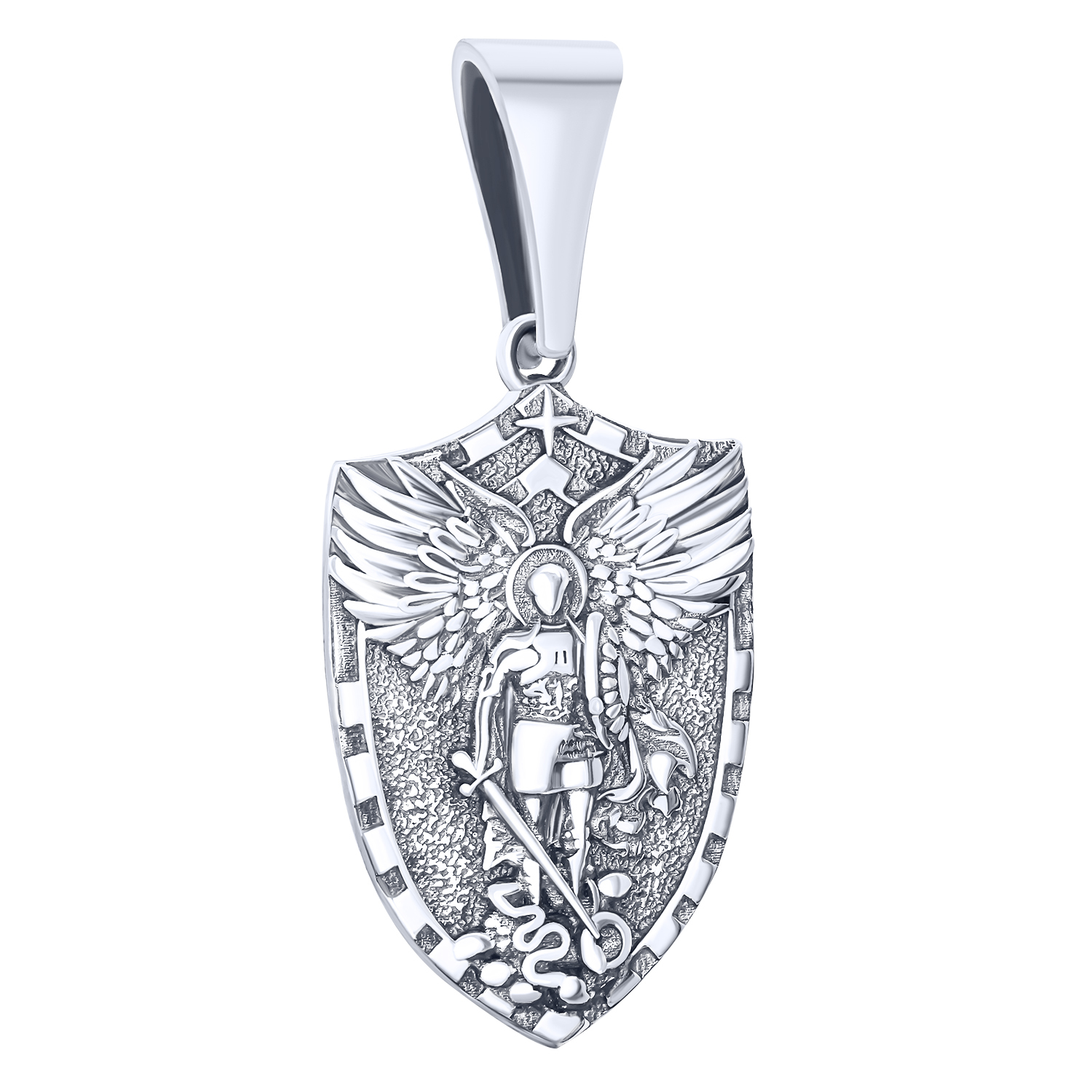 Серебряный подвес «Архангел Михаил» — изделие, которое может служить как украшением, так и оберегом, защищающим от врагов и недугов. Носить его могут мужчины и женщины. Подвес выполнен в форме щита, на который нанесен образ архангела с раскрытыми за спиной крыльями и направленным вниз мечом, показывающий, что не собирается нападать, но готов к защите. Создано украшение из серебра 925 пробы, благодаря чему металл получил глубокий цвет и матовую поверхность. Чтобы носить подвес на шее, его стоит дополнить цепочкой.