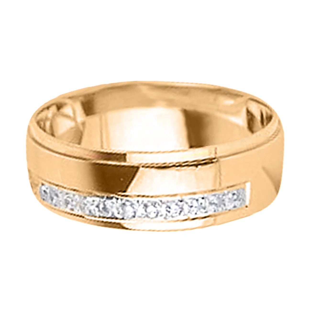 Модная вариация обручального кольца — изделие из красного золота. Состав пробы 585 способствует прочности, что важно в условиях ежедневного ношения. Блеск фианитов и теплый оттенок красного гармонично сочетаются в украшении. Ободок декорирован дорожкой прозрачных сияющих фианитов, которые придают ему особенный шарм. Кольцо не содержит дополнительных элементов, поэтому подходит на каждый день, не цепляется за одежду и волосы. Изделие выполнено в стиле унисекс и идет как женщине, так и мужчине.