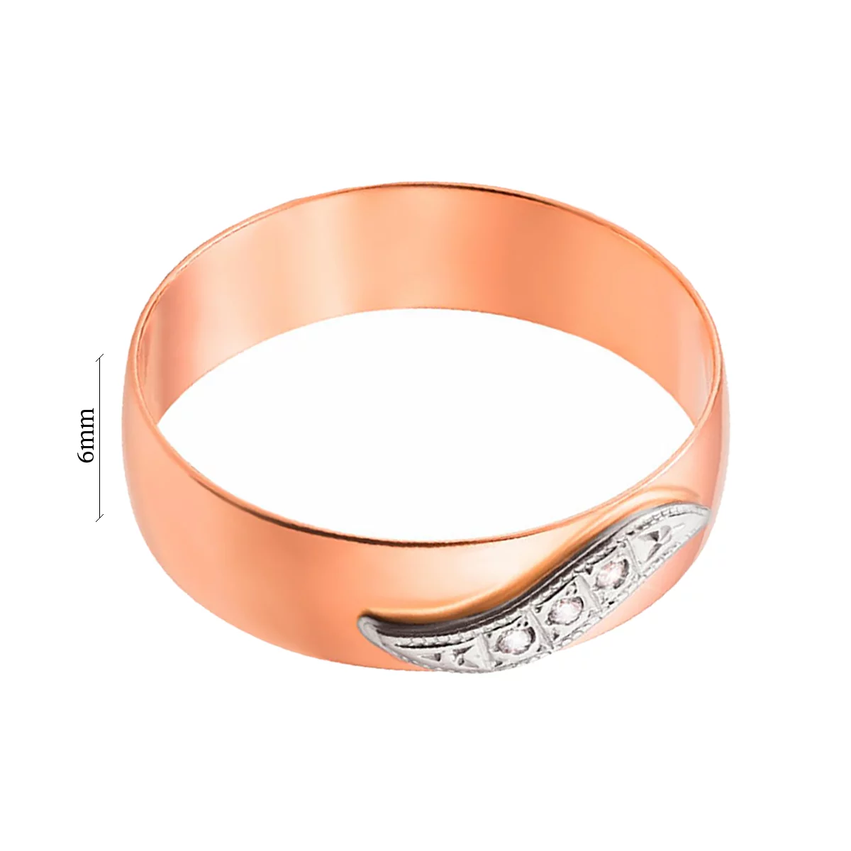 Класична форма жіночої обручки з комбінованого золота виділяється за рахунок фігурної деталі з трьома акуратними діамантами.