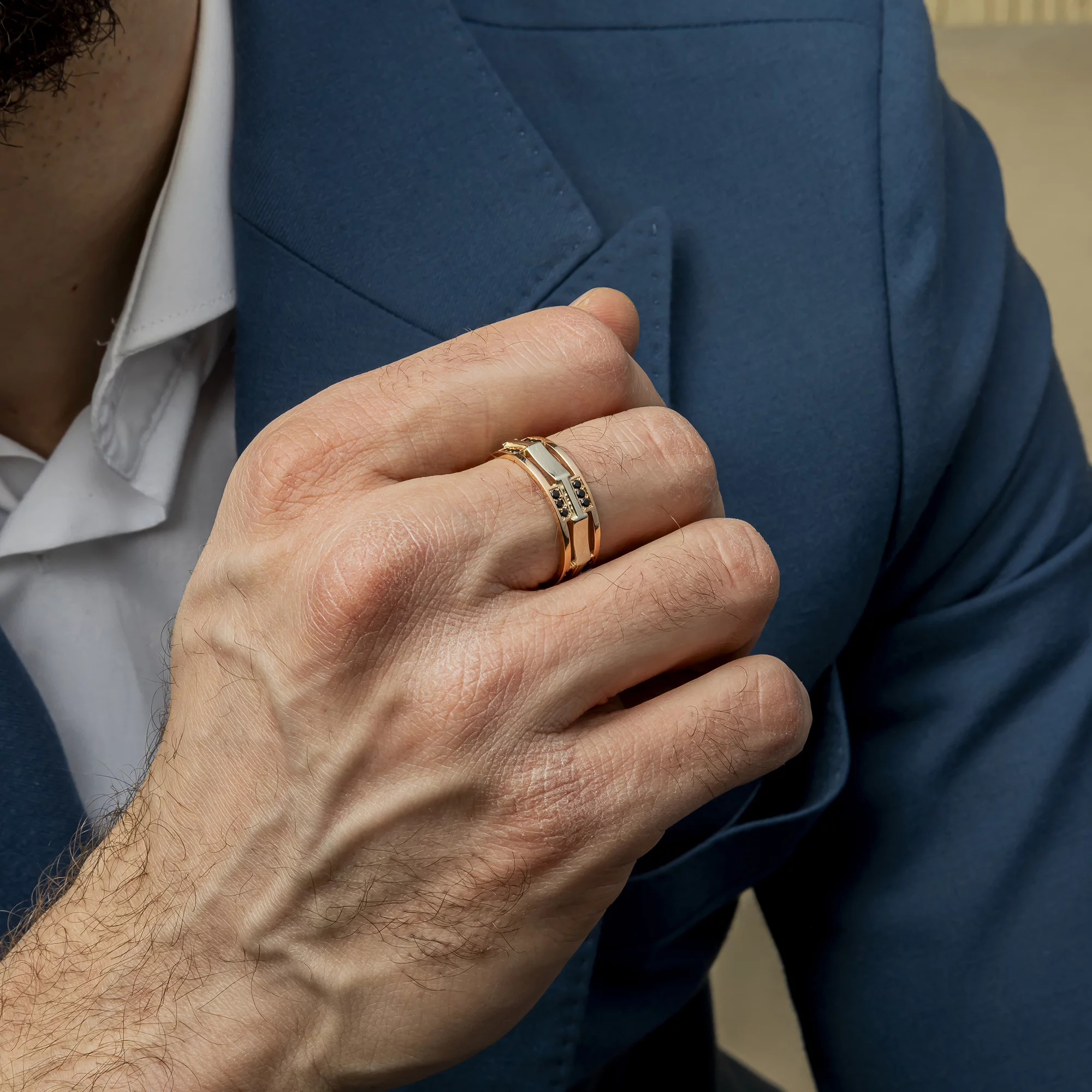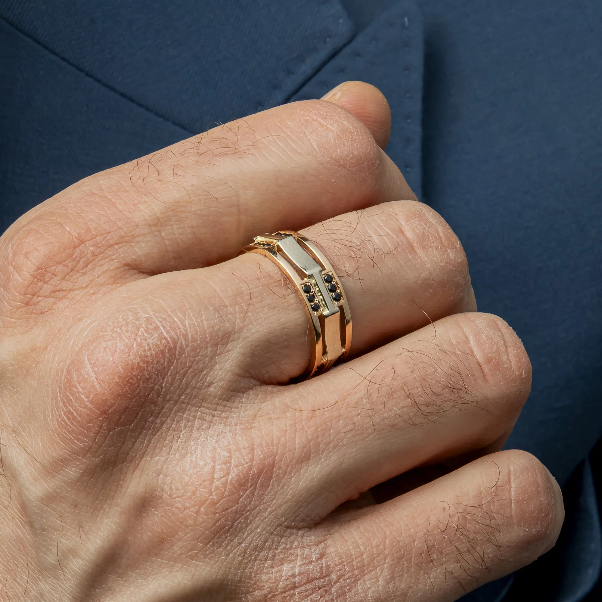 Перстень-печатка в комбинированном золоте с дорожкой из фианитов и эмалью - 1874594