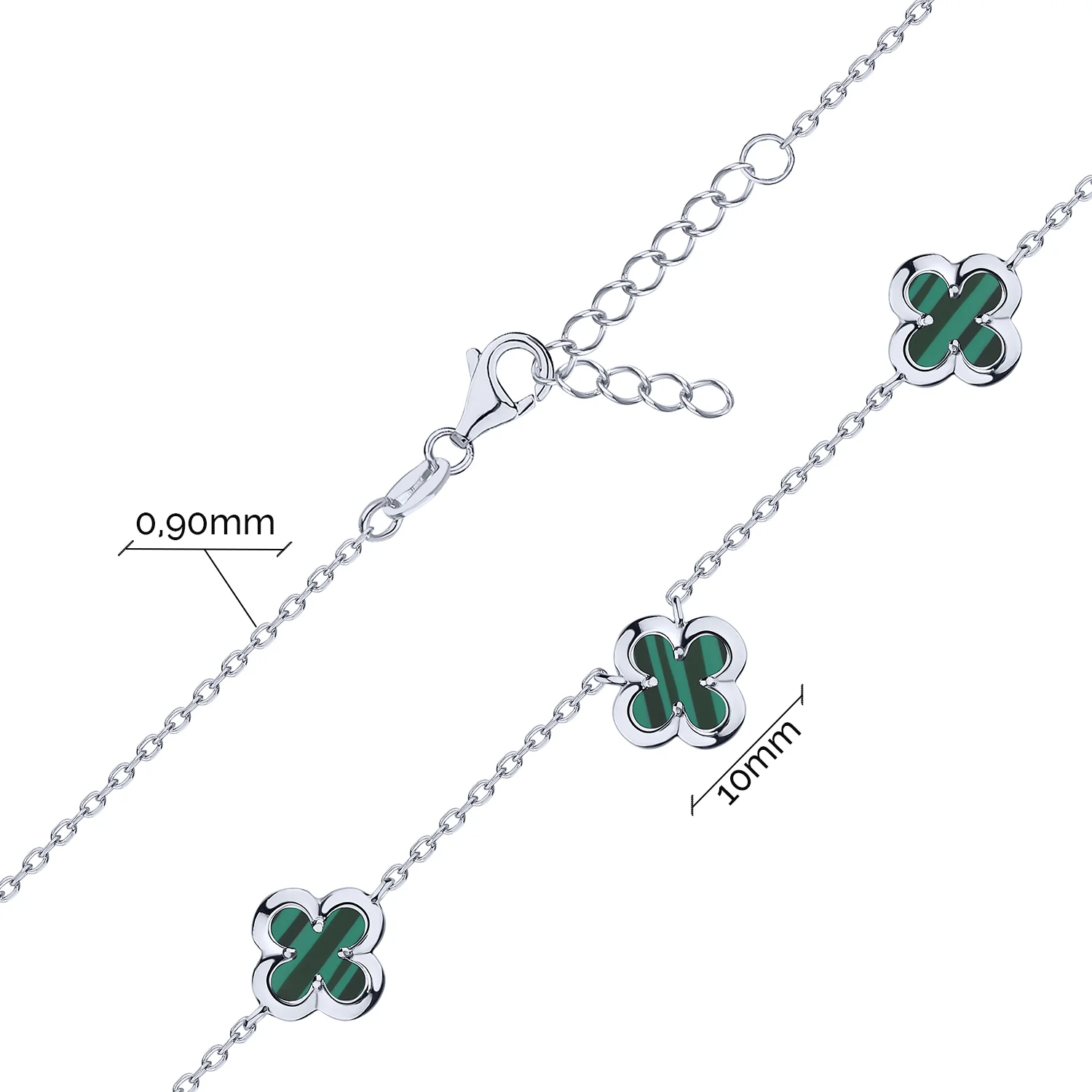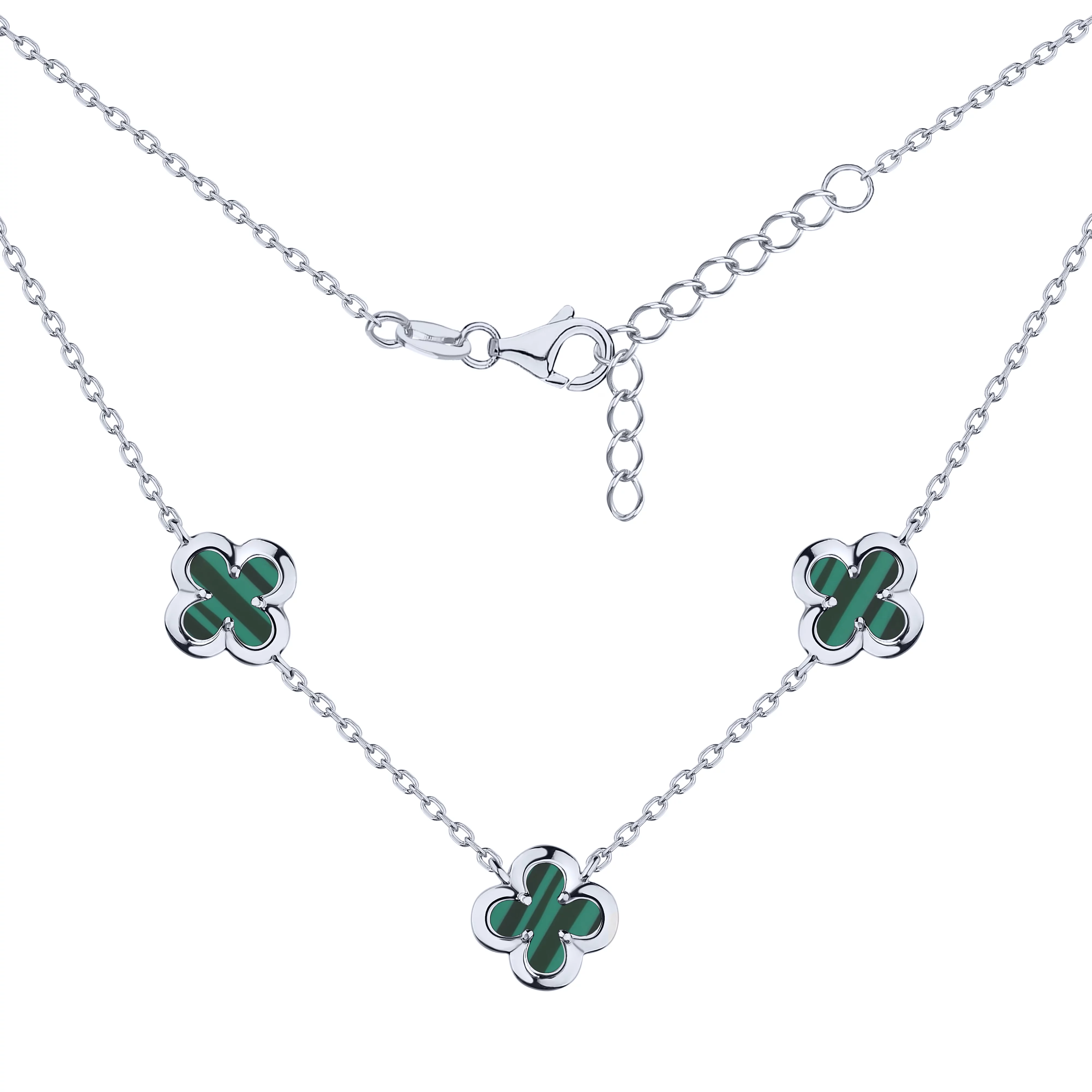 Стильное колье с подвесом из серебра в форме клевера с якорным плетением, малахитом и фианитами - 1935096