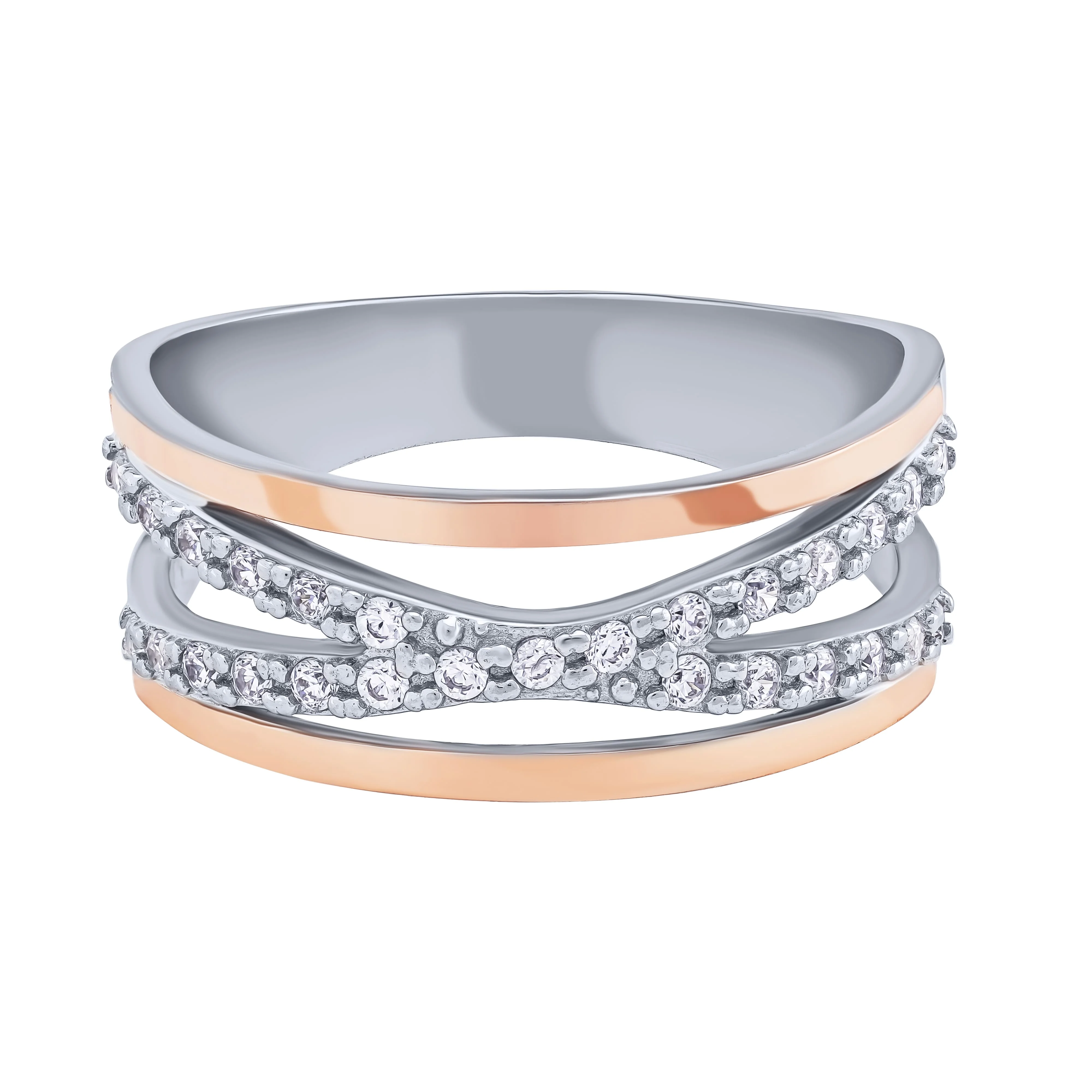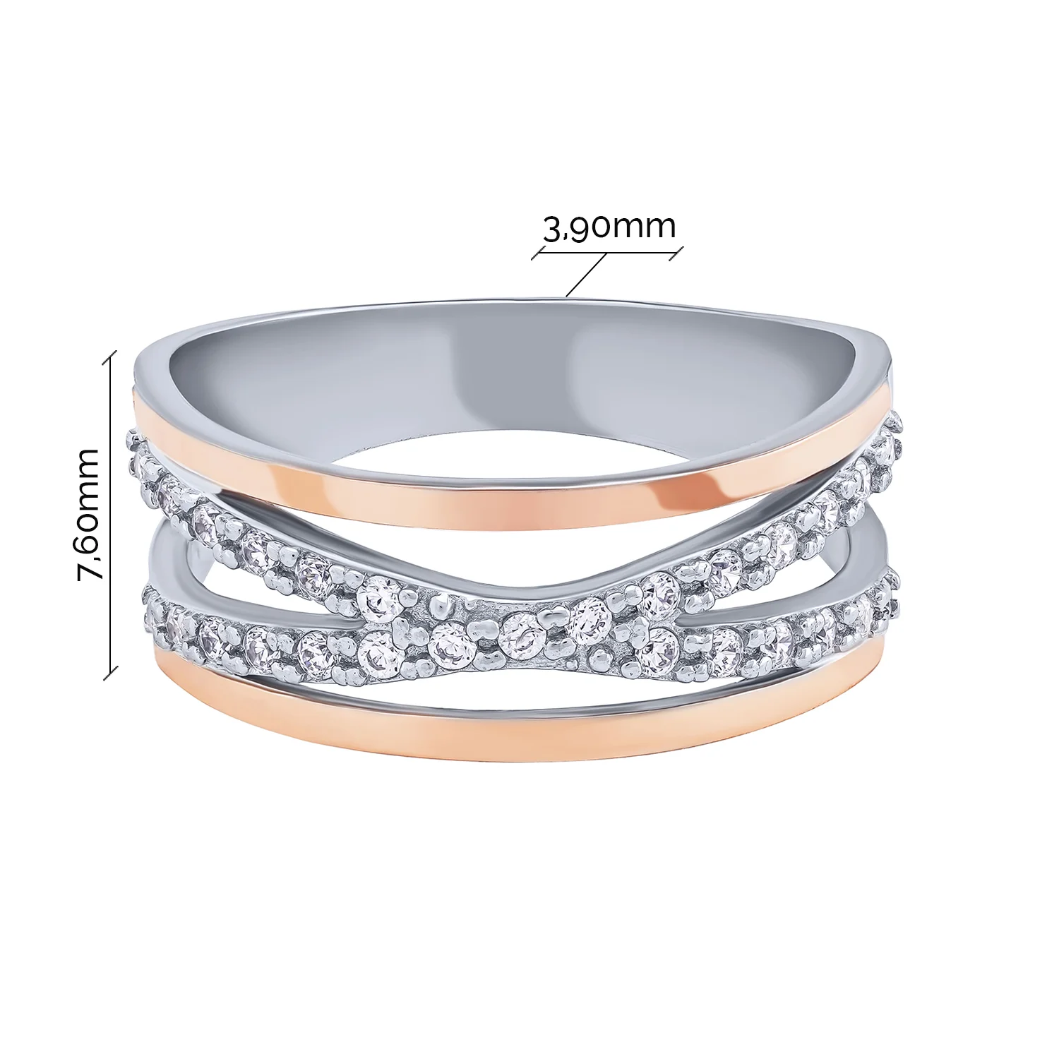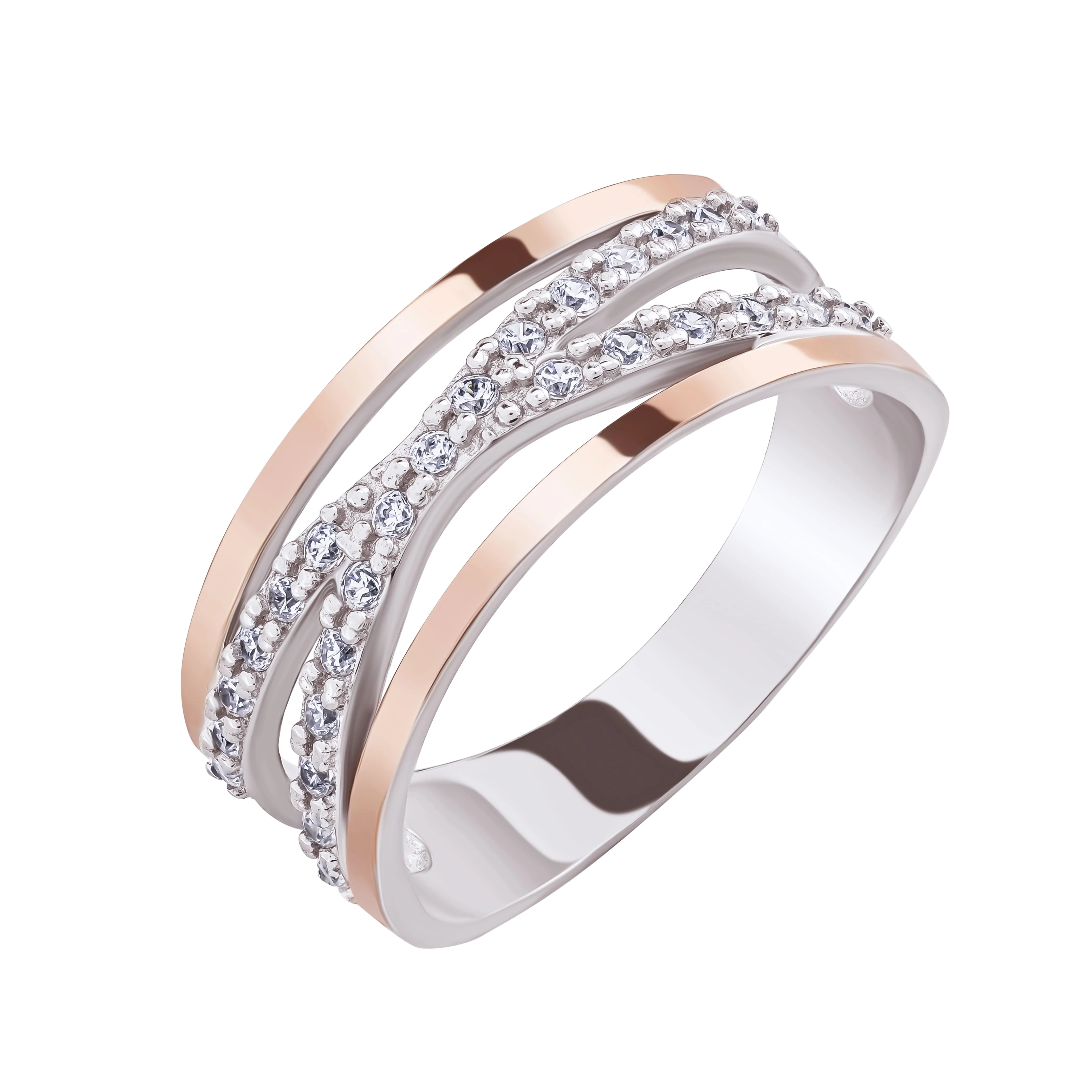 Серебряное кольцо "Переплетение" с фианитами и золотой накладкой - 2081259