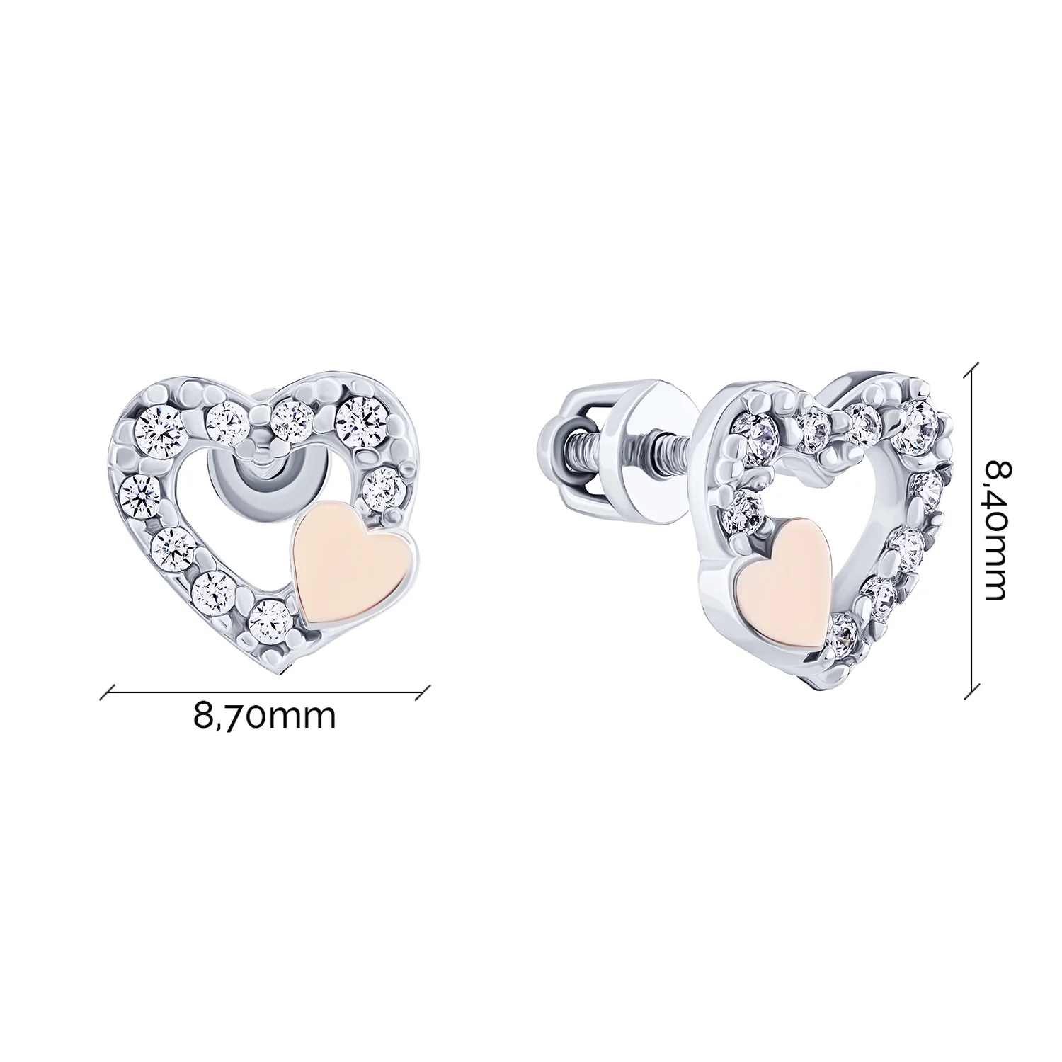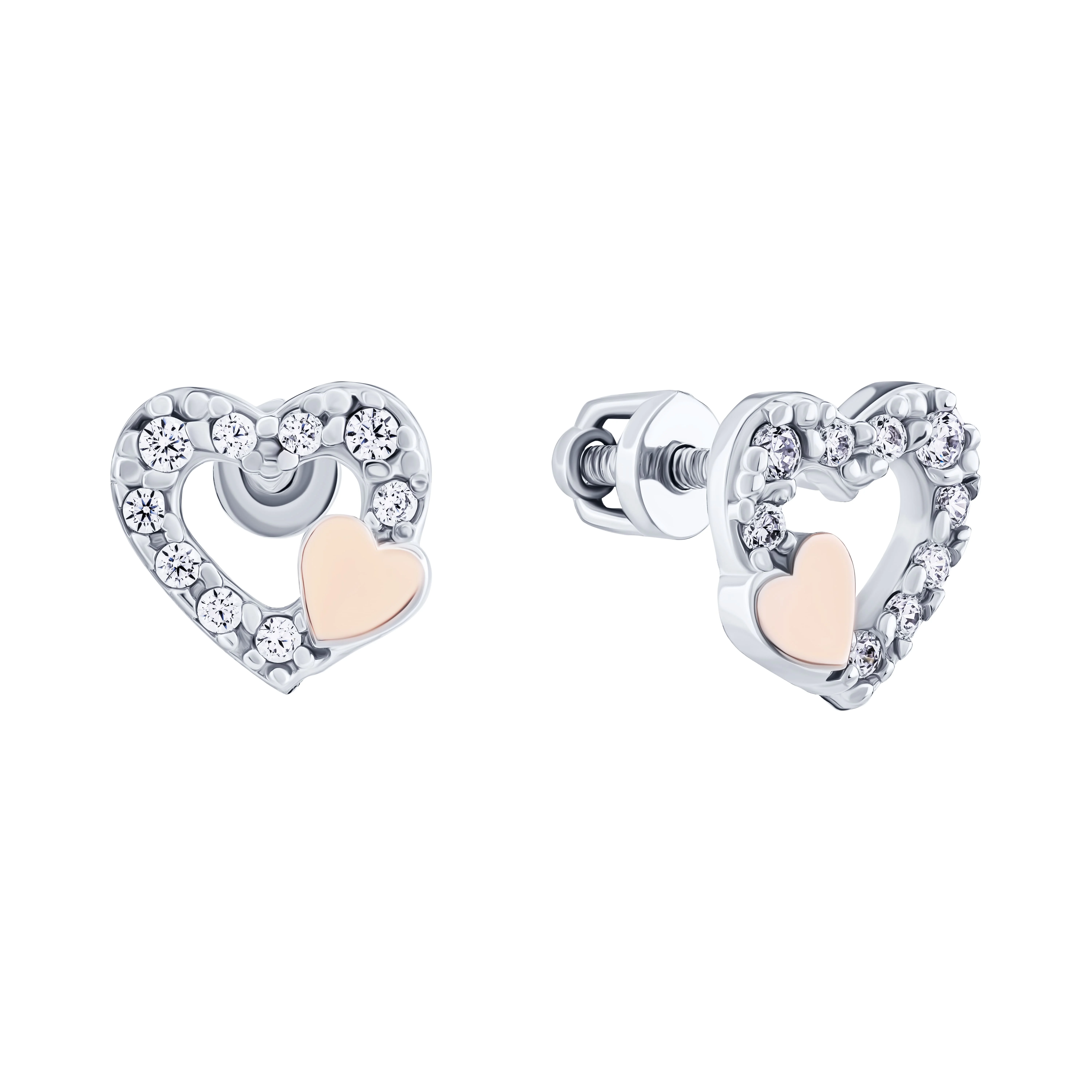 Серебряные серьги-пусеты "Сердце" с золотой накладкой и фианитами - 2074545