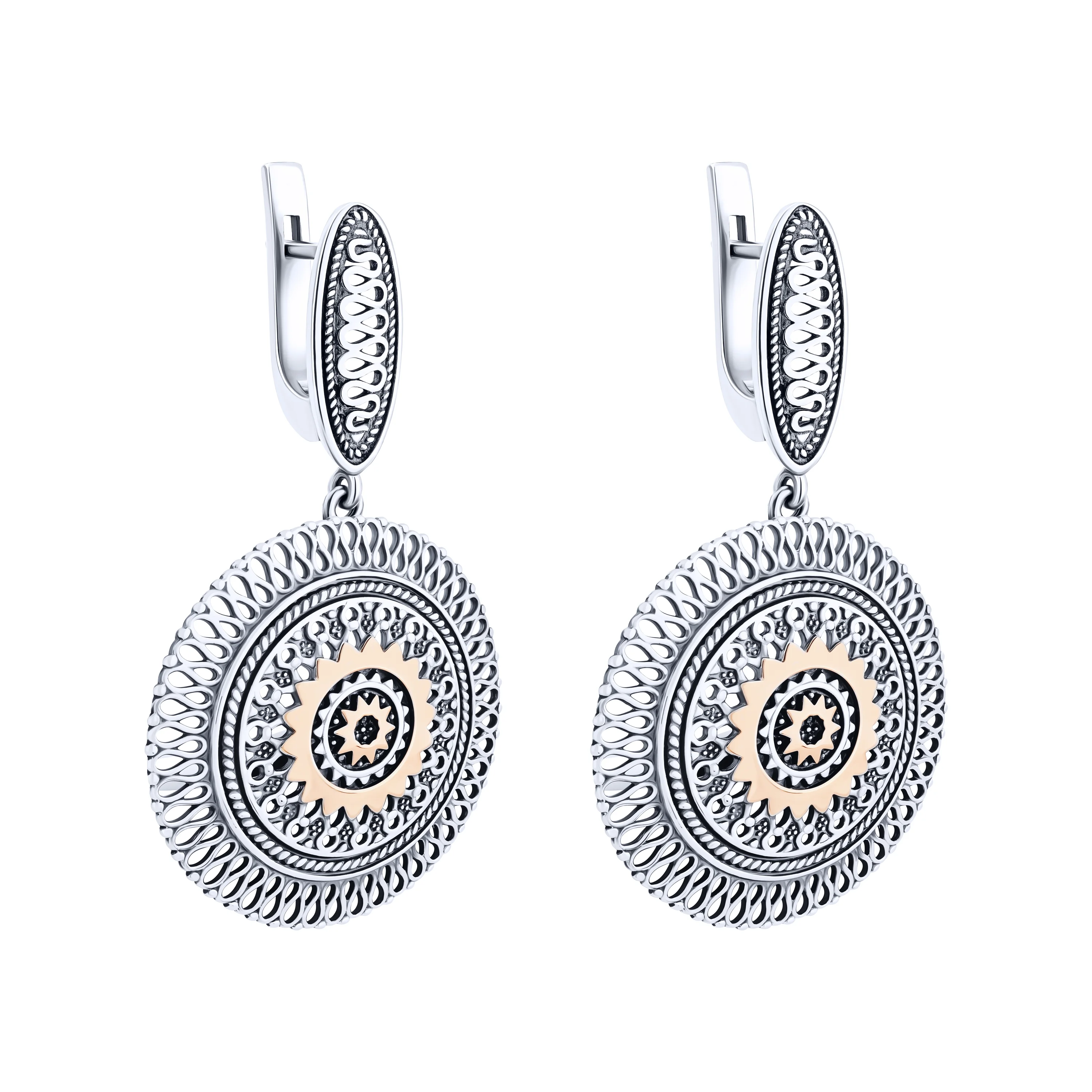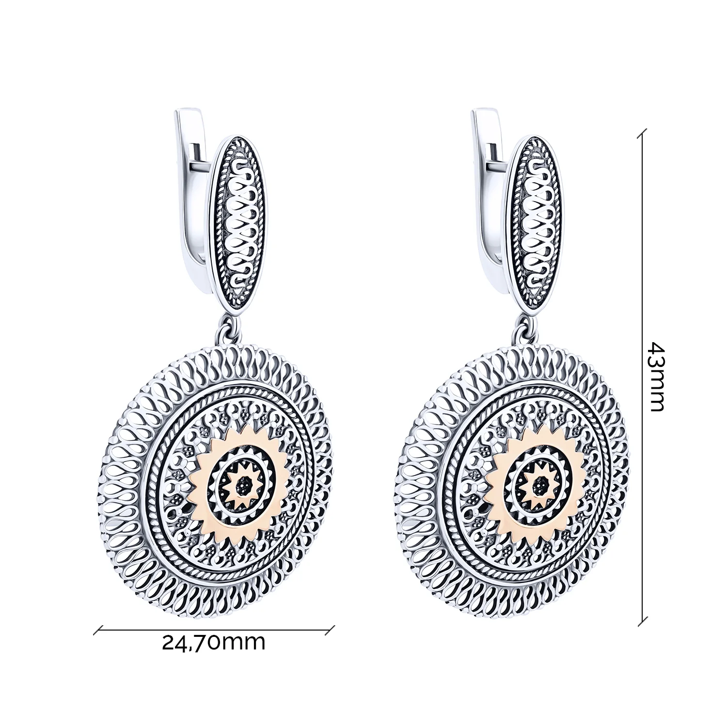 Серебряные серьги с подвесом "Круг" с чернением и золотой накладкой - 2182438