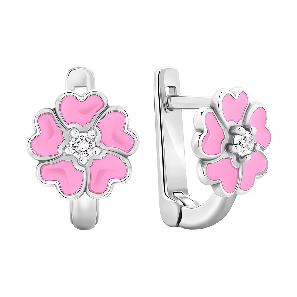 Серебряные серьги "Цветы" с эмалью и фианитом - 407867