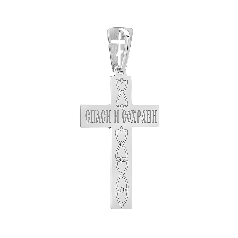 Для утонченного изделия использовалось серебро 925 пробы. Это значит, что крестик отличается стойкими эксплуатационными свойствами при сбережении декоративной ценности самого сплава. К тому же, такая проба позволяет создавать четкие, ярко выраженные узоры, которые можно оценить по внешнему виду изделия. Изюминка украшения – соединяющее колечко с закрывающей пластиной, на которой аккуратно вырезан крест. На обратной стороне изделия нанесена надпись «Спаси и Сохрани», что позволяет использовать стильный аксессуар при проведении таинства крещения.