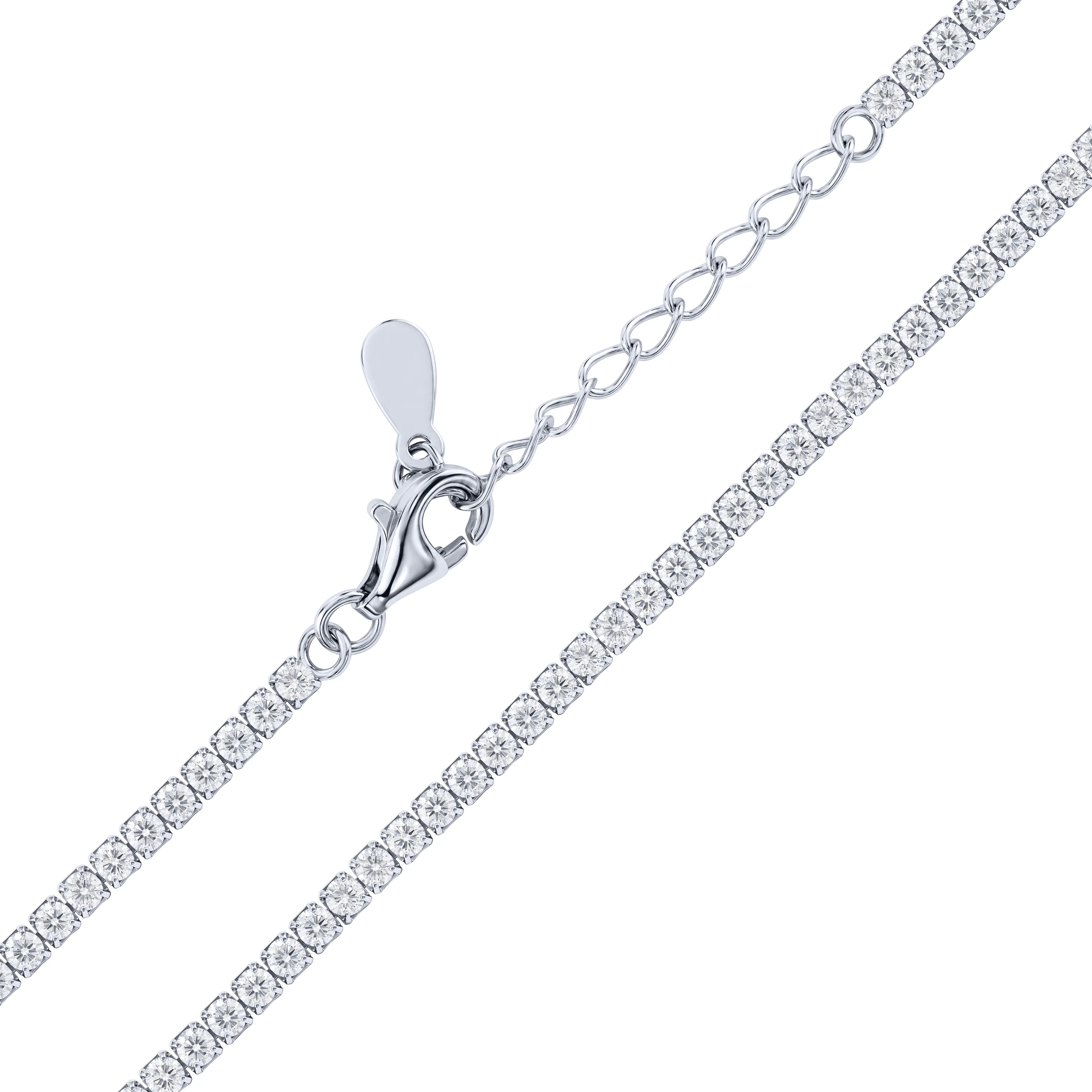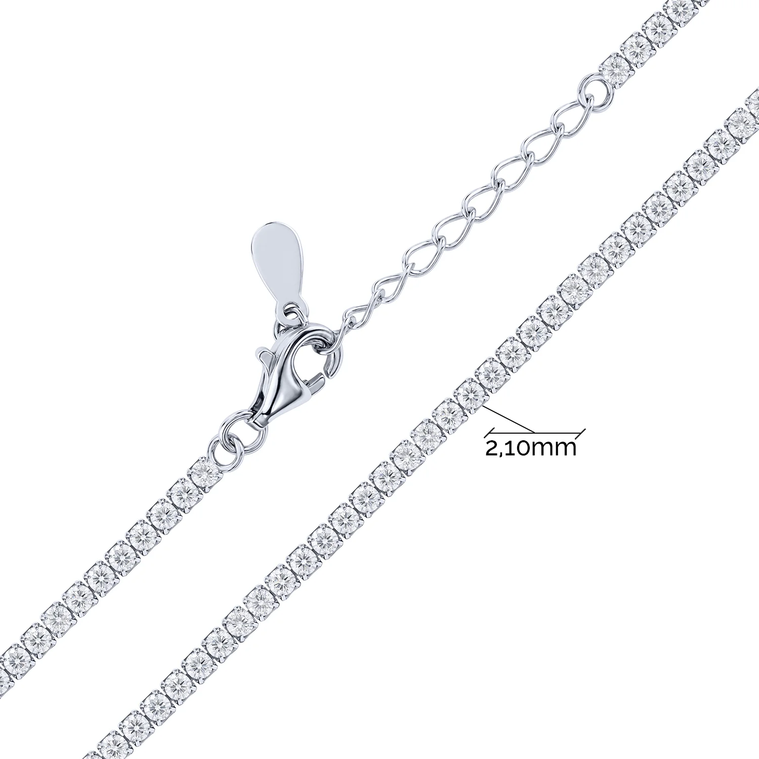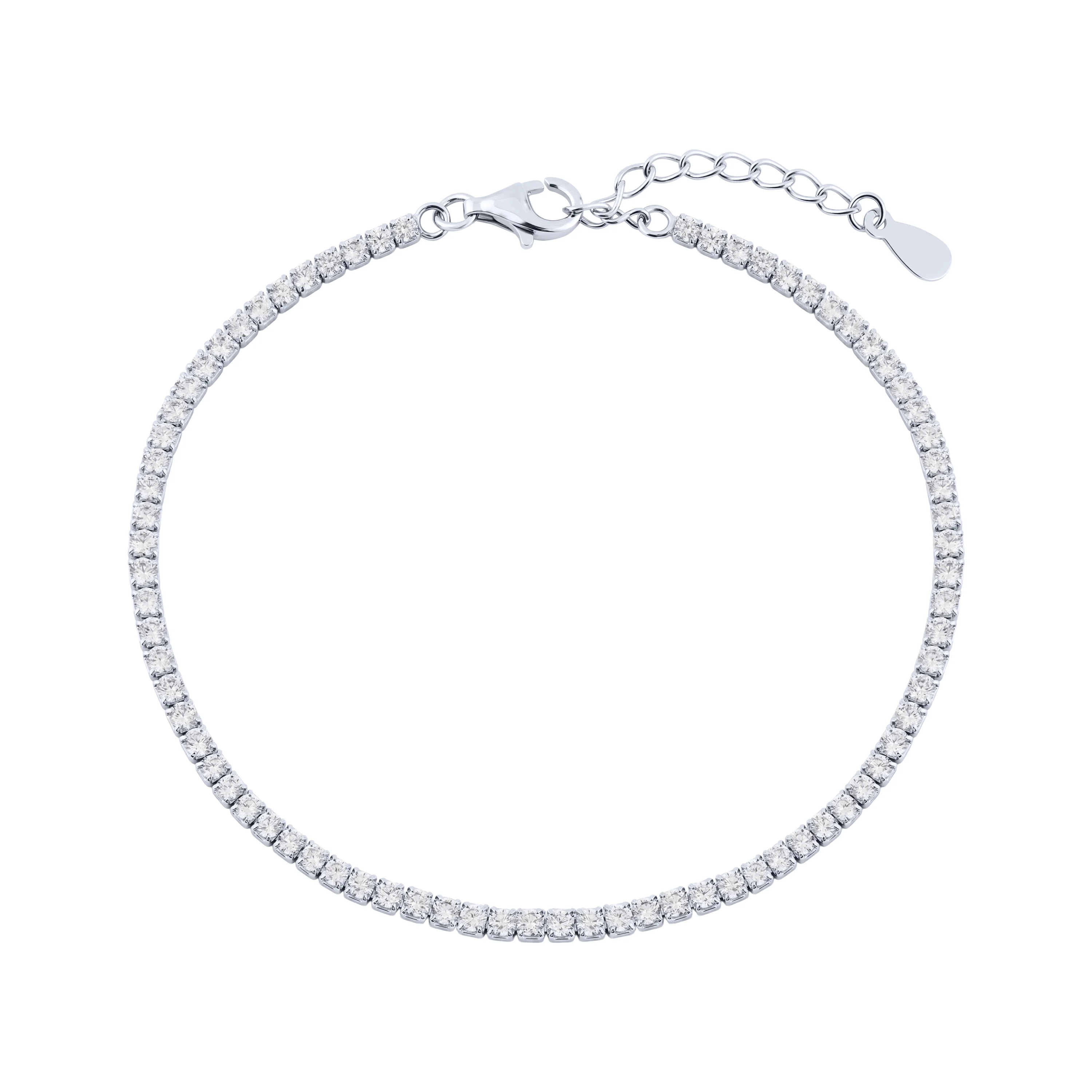 Серебряный теннисный браслет с фианитами — украшение с гибкой основой, которое подходит как для повседневности, так и для праздничных образов, в том числе и для свадебных. Изделие выполнено в виде цепочки с одинаковыми звеньями, соединенными шарнирами и составляющими ровную дорожку. Браслет изготовлен из серебра 925 пробы с родированием и инкрустирован белыми фианитами, блеск которых делает его ярким и сияющим. Надежная застежка в виде карабина позволяет закрепить украшение на руке и спокойно его носить длительное время. Такой браслет станет базой личной ювелирной коллекции.
