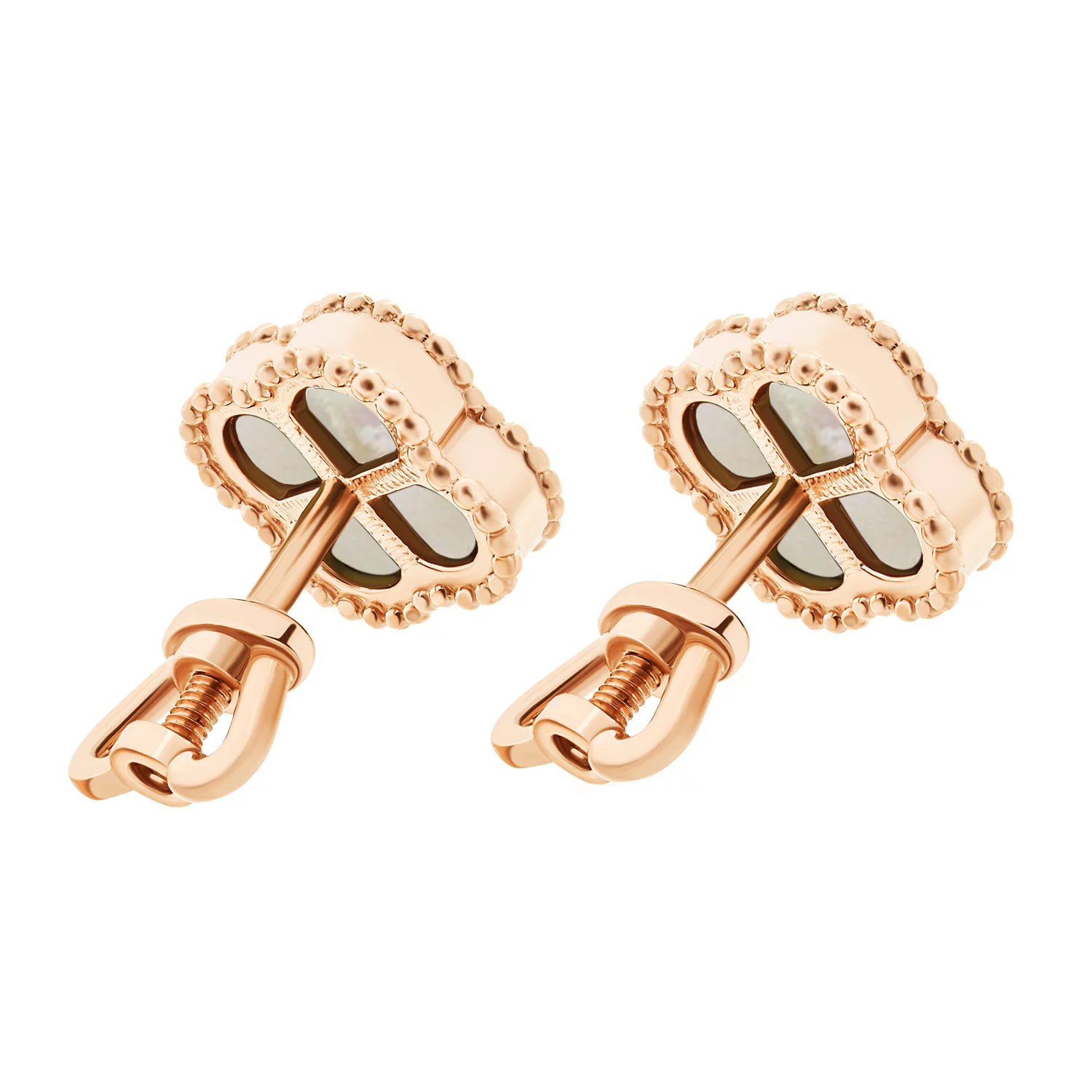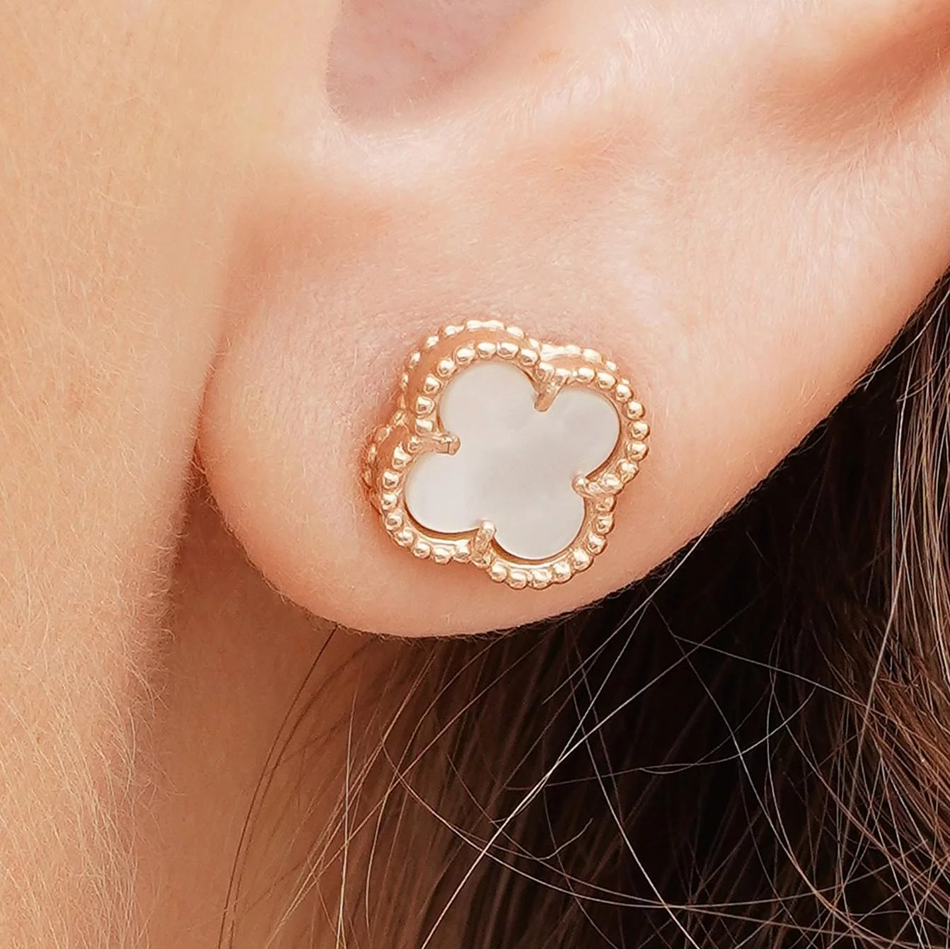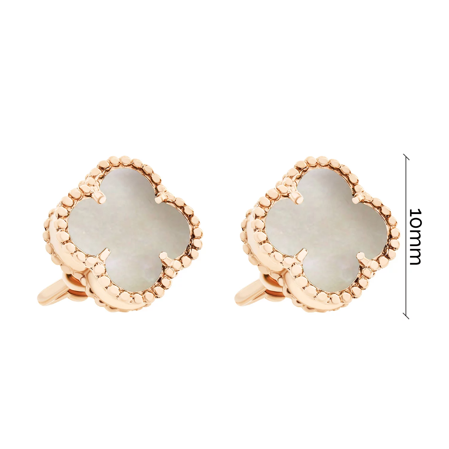 Стильные сережки-гвоздики "Клевер" из желтого золота с перламутром - 1919820
