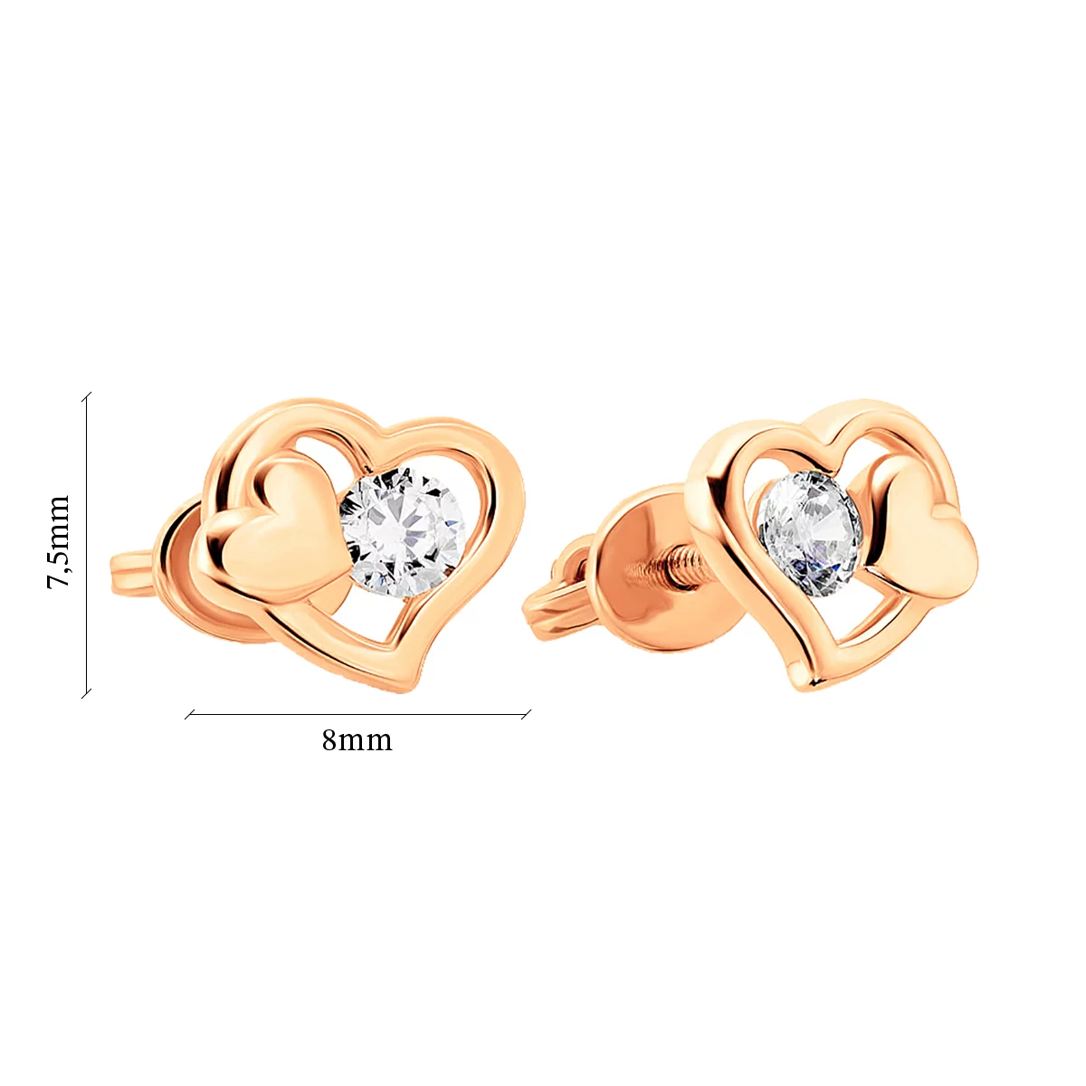 Сережки-гвоздики из красного золота с фианитом Сердечки - 948697