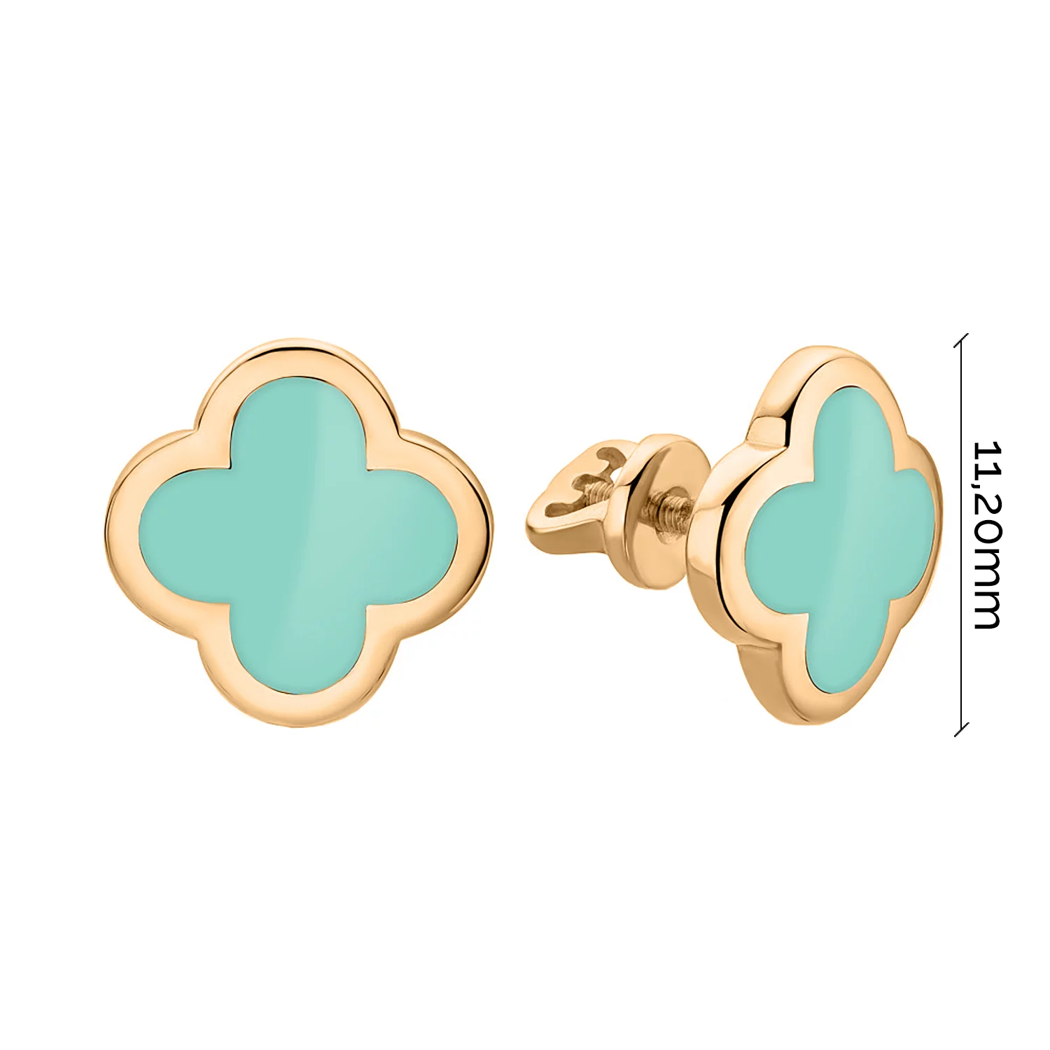 Стильные сережки-гвоздики "Клевер" из красного золота с ониксом - 1878296