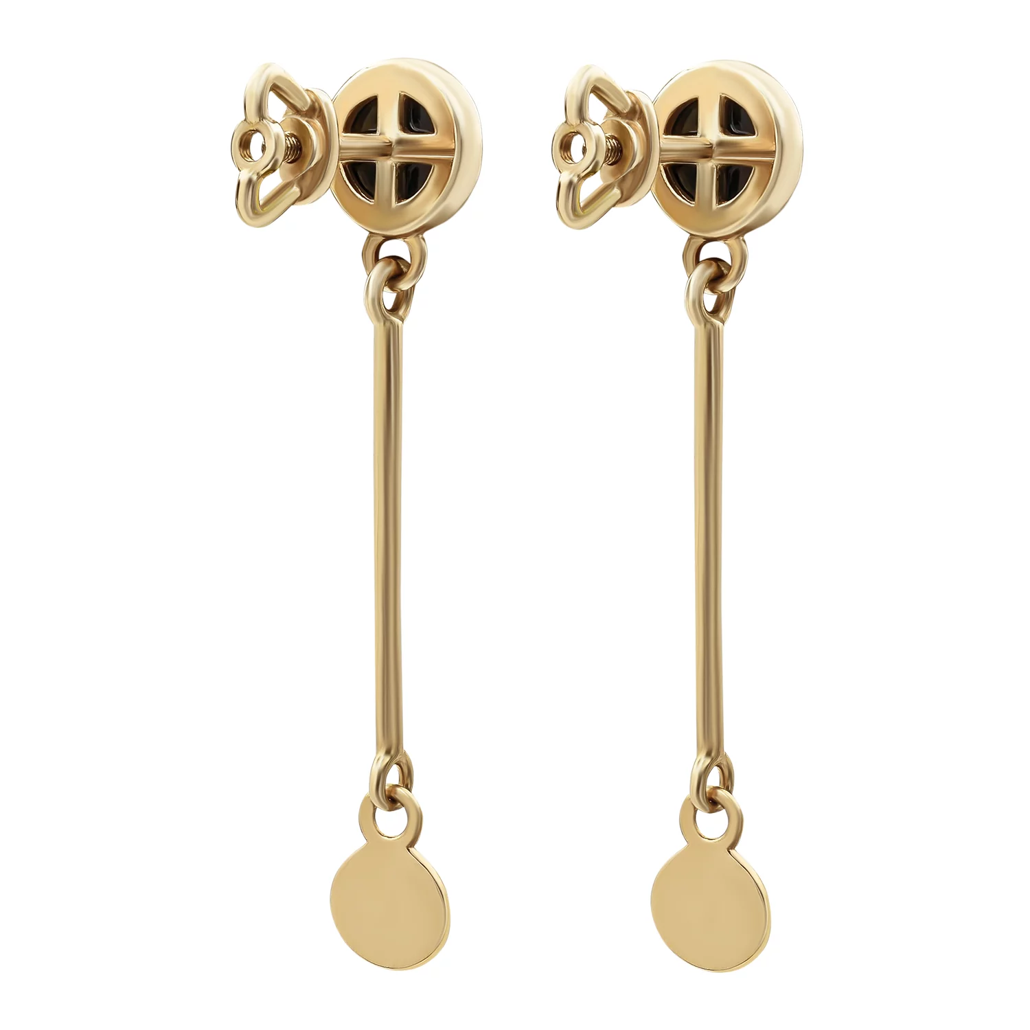 Утонченные серьги-гвоздики fashion-стиля отличаются изящным внешним видом. Изготовлены из красного золота 585-ой пробы, благодаря чему они прочные и износостойкие. Черный агат в качестве вставки — круглого типа огранки. Зафиксирован камень способом гнездовой закрепки. Застегиваются сережки на винтовой замок, простой, надежный и удобный в пользовании. Его преимущество — возможность регулировать степень зажима. Серьги-гвоздики с агатом и подвеской подойдут для вашего праздничного образа и будут уместны для повседневной носки.