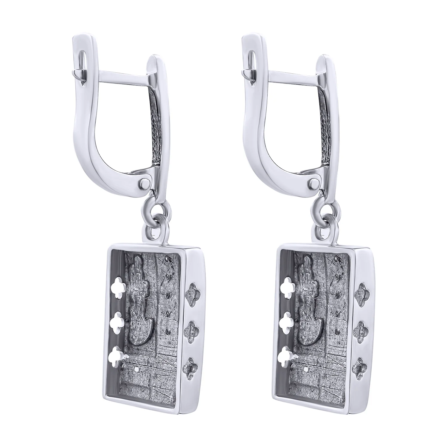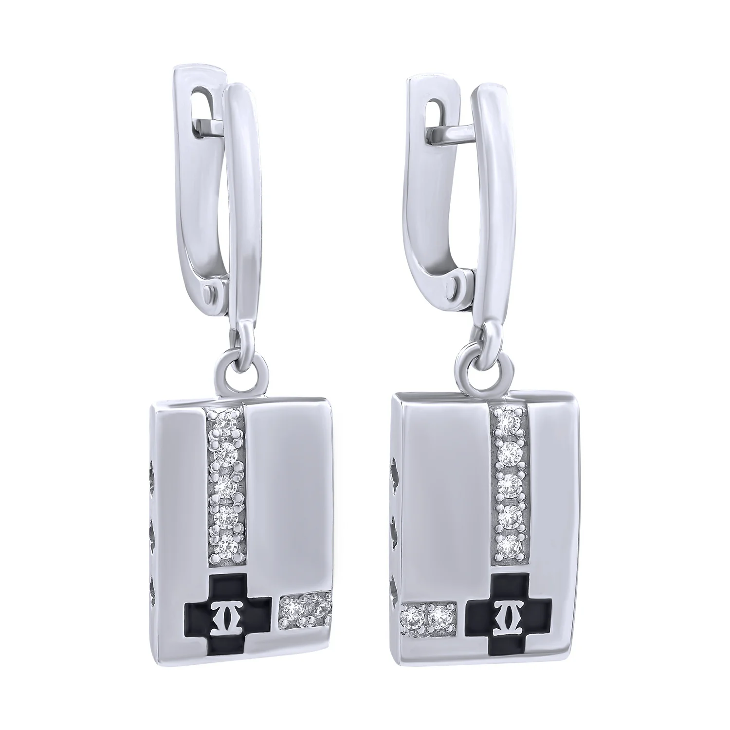 Сережки из белого золота с подвесами с фианитами и черной эмалью - 411137