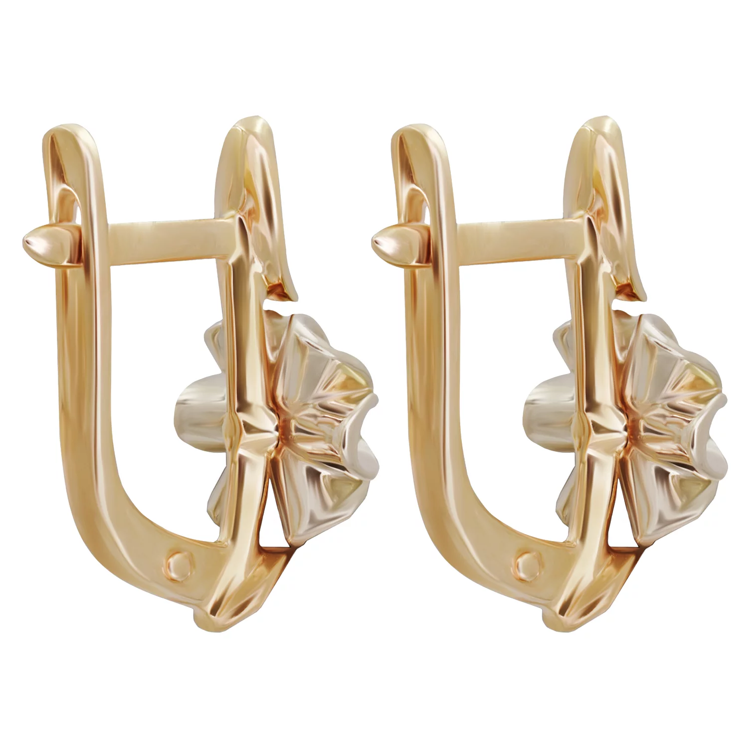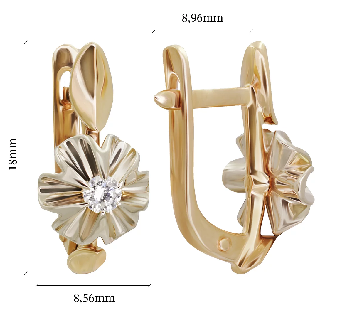 Эта роскошная модель пополнит вашу коллекцию ювелирных украшений для особых случаев. Золотые серьги в стиле Fashion станут удачным дополнением нарядного платья или брючного костюма. Понравятся приверженцам растительной тематики. Декоративный элемент выполнен в форме цветка с центральной вставкой бриллианта. Самоцвет круглой огранки искрится прекрасными переливами на свету. Полированное красное золото усиливает блеск драгоценного камня. Композицию завершают листочки внизу и вверху изделий. Сережки удобно и надежно держатся в ушах, застегиваются на английский замок.