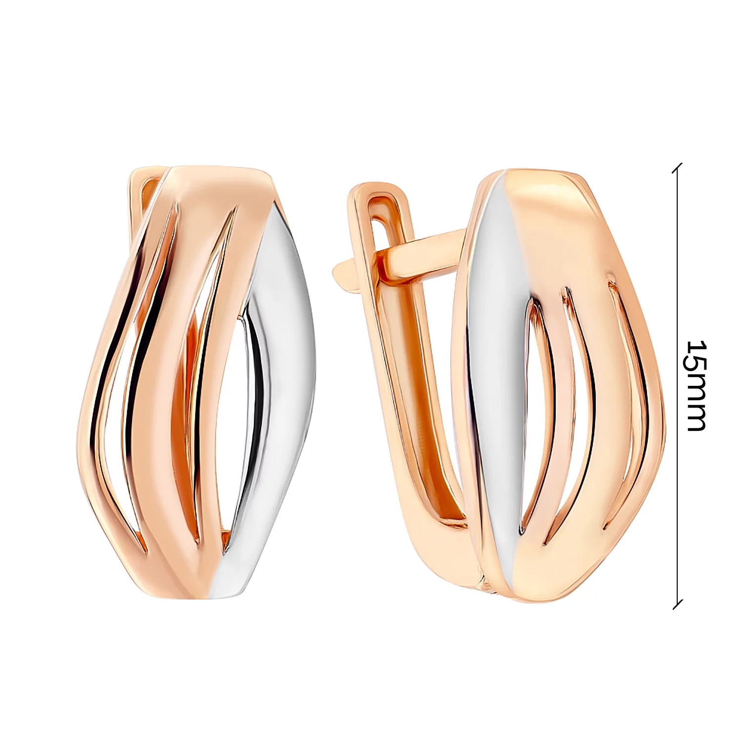 Элегантные серьги из комбинированного золота созданы для тех, кто ценит стильные и утончённые украшения. Оригинальный дизайн объединяет плавные линии и изысканную игру света на поверхности драгоценного металла. Основу составляет тёплое сияние красного золота, которое гармонично сочетается с благородными вставками из белого золота, создавая эффект лёгкости и воздушности. Вырезы придают украшению динамику, позволяя свету проникать сквозь металл и подчёркивать изящные формы. Такая модель станет универсальным дополнением к повседневному и вечернему образу, добавляя нотку утончённой элегантности. Удобная английская застёжка гарантирует комфорт и надёжность, а безупречное качество исполнения делает эти серьги отличным выбором для тех, кто предпочитает элегантную классику с современным характером.