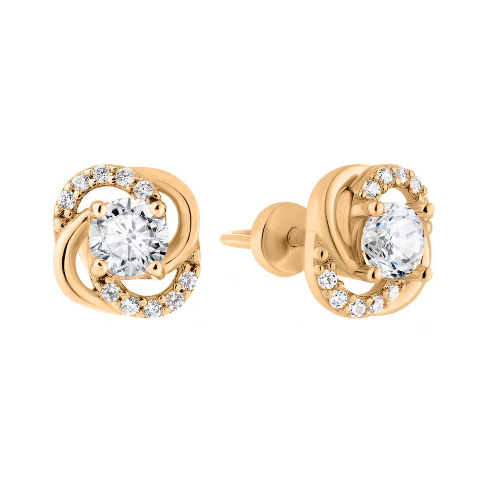 Сережки-гвоздики с топазом лондон и фианитами из красного золота - 1525469