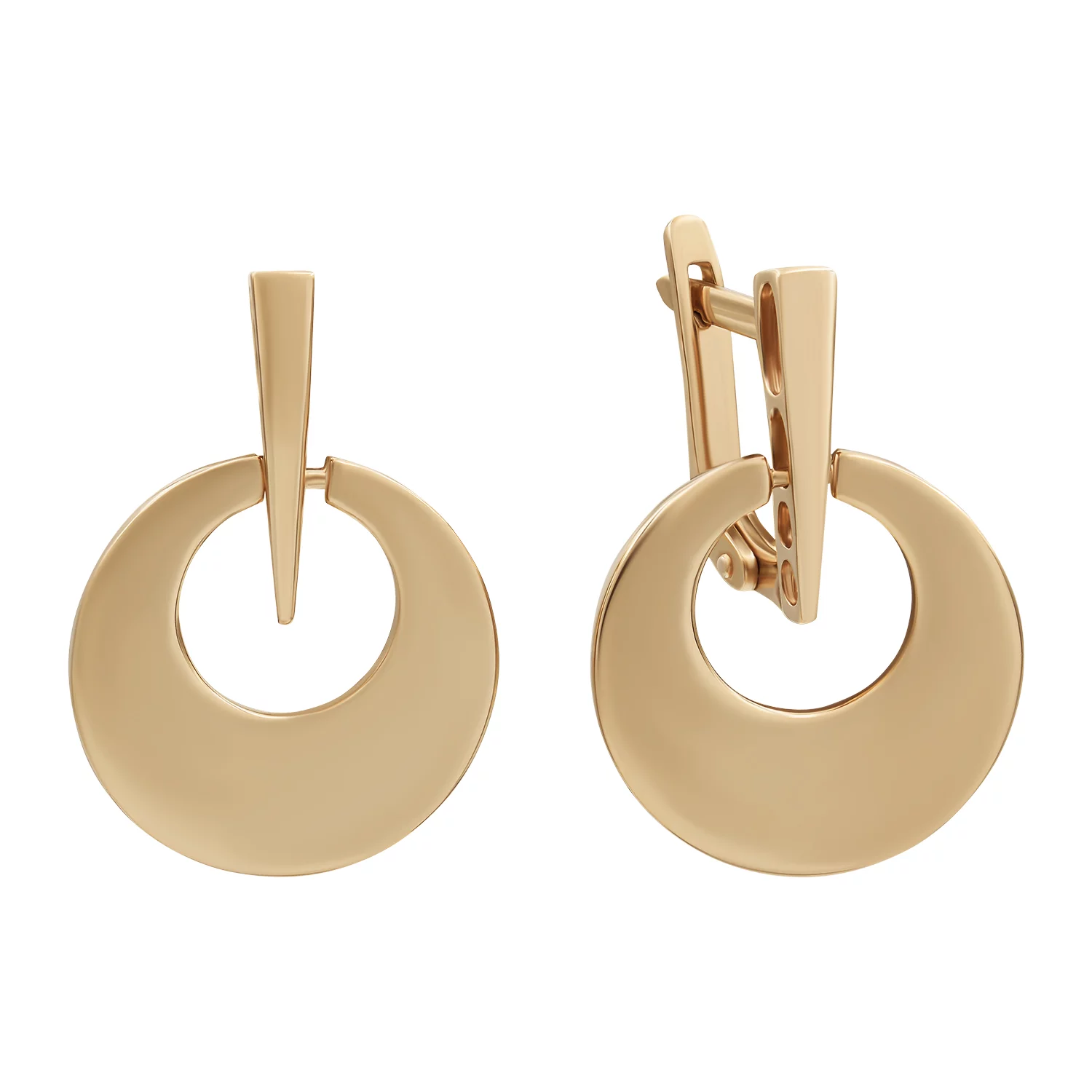 Яркое украшение для уверенных личностей. Креативные женские серьги из золота 585 пробы обладают теплым оттенком благодаря добавлению в сплав меди. Геометрические фигуры в дизайне делают изделие лаконичным и стильным. Массивные кольца на вертикальном основании приковывают взгляды. Английский замок отличается особой практичностью в использовании, что минимизирует риски потери изделия. Сережки с кольцами станут ценным подарком на любой праздник или без повода. Обладательница такого украшения не останется без внимания.