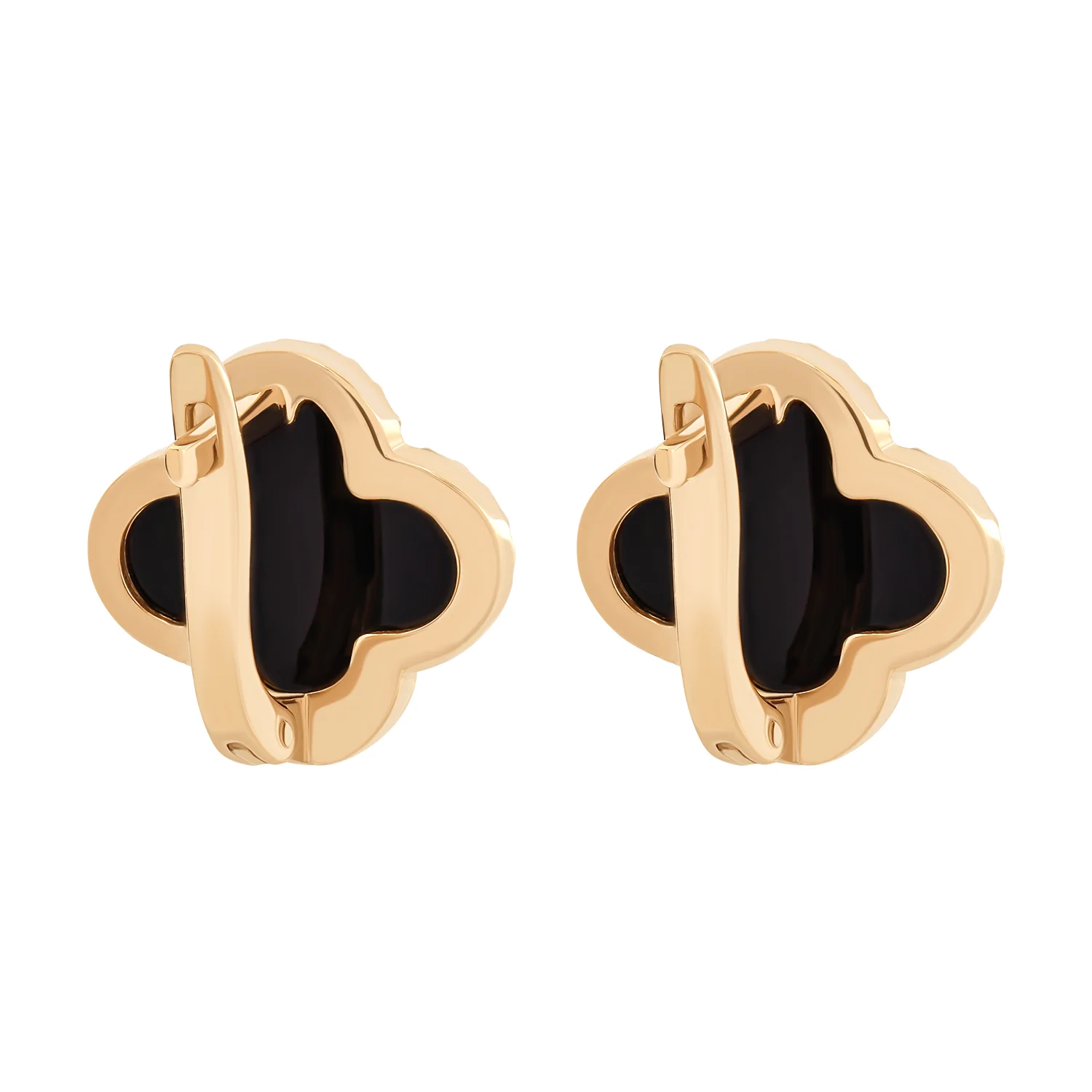 Стильные сережки-гвоздики "Клевер" из красного золота с ониксом - 1878296