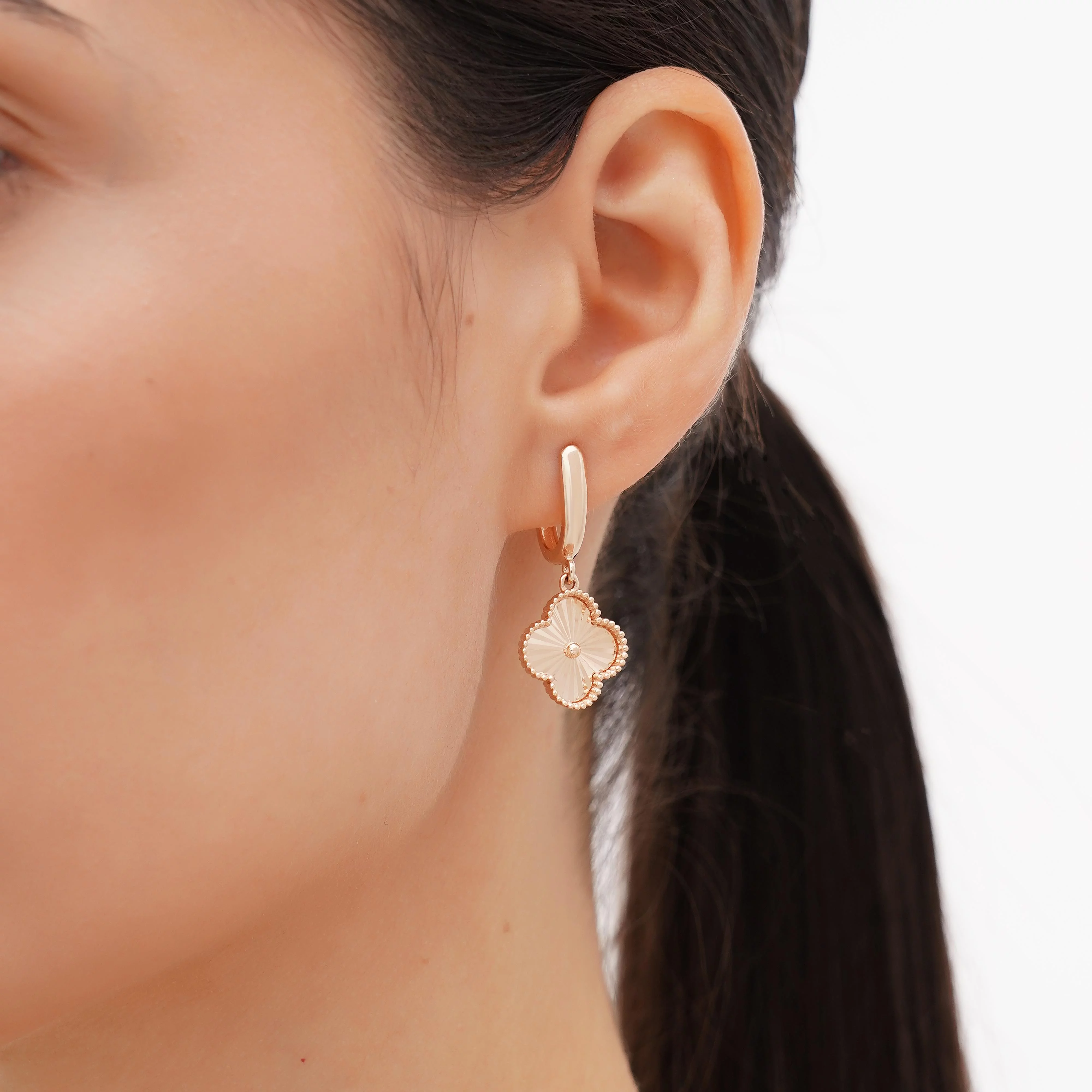 Сережки из красного золота с подвесками «Клевер», выполненные в стиле Ван Клиф, станут элегантным дополнением ювелирного ансамбля или сольным украшением, придающим образу изысканную роскошь. Изготовлены изделия из драгоценного металла 585 пробы. Красный оттенок золоту придает медь (9,5%), добавленная в лигатуру сплава. Элегантный английский замок надежно фиксирует сережки в ушах, а украшают их подвески в форме четырехлистного клевера. Такие ювелирные изделия станут памятным подарком на выпускной, совершеннолетие и другие праздники.