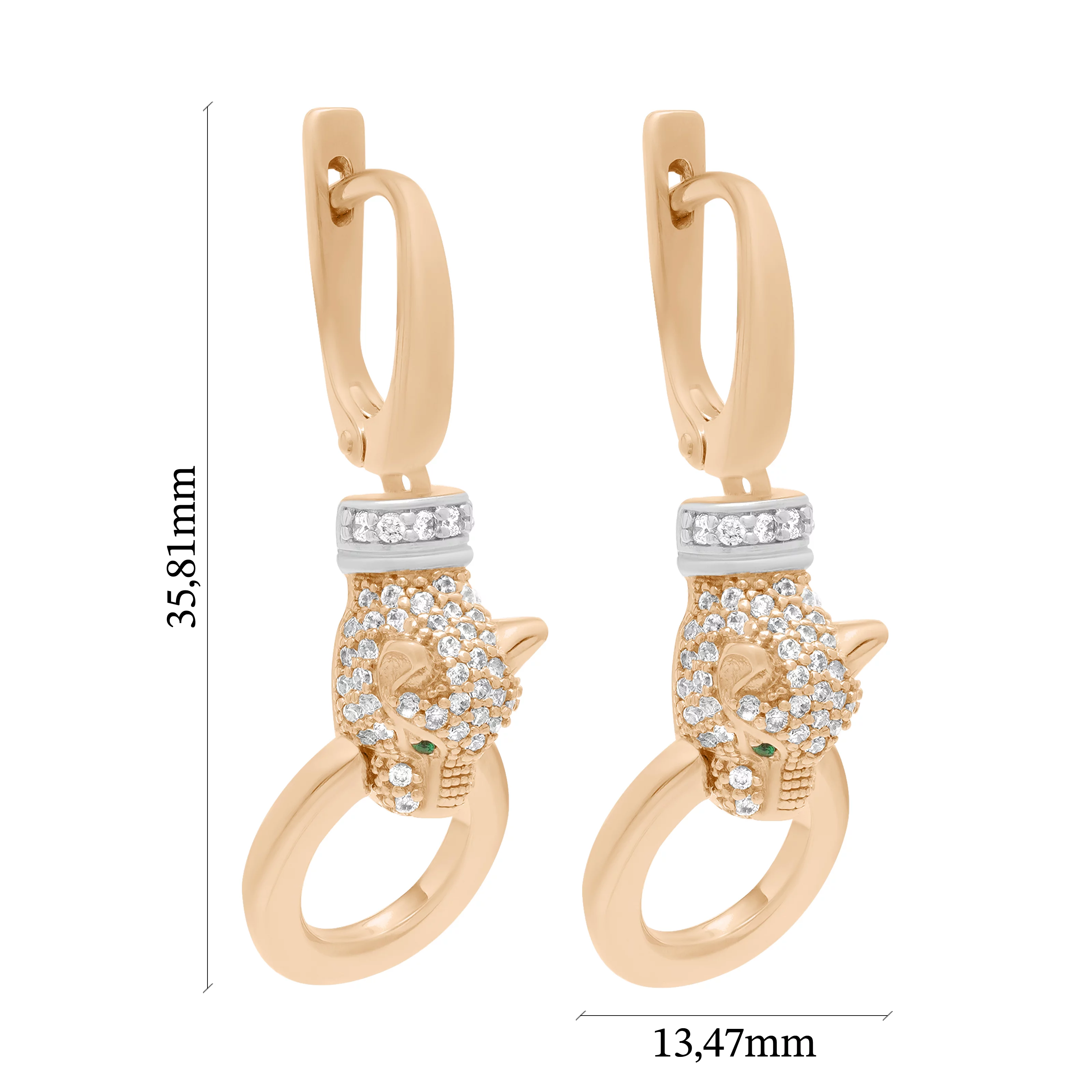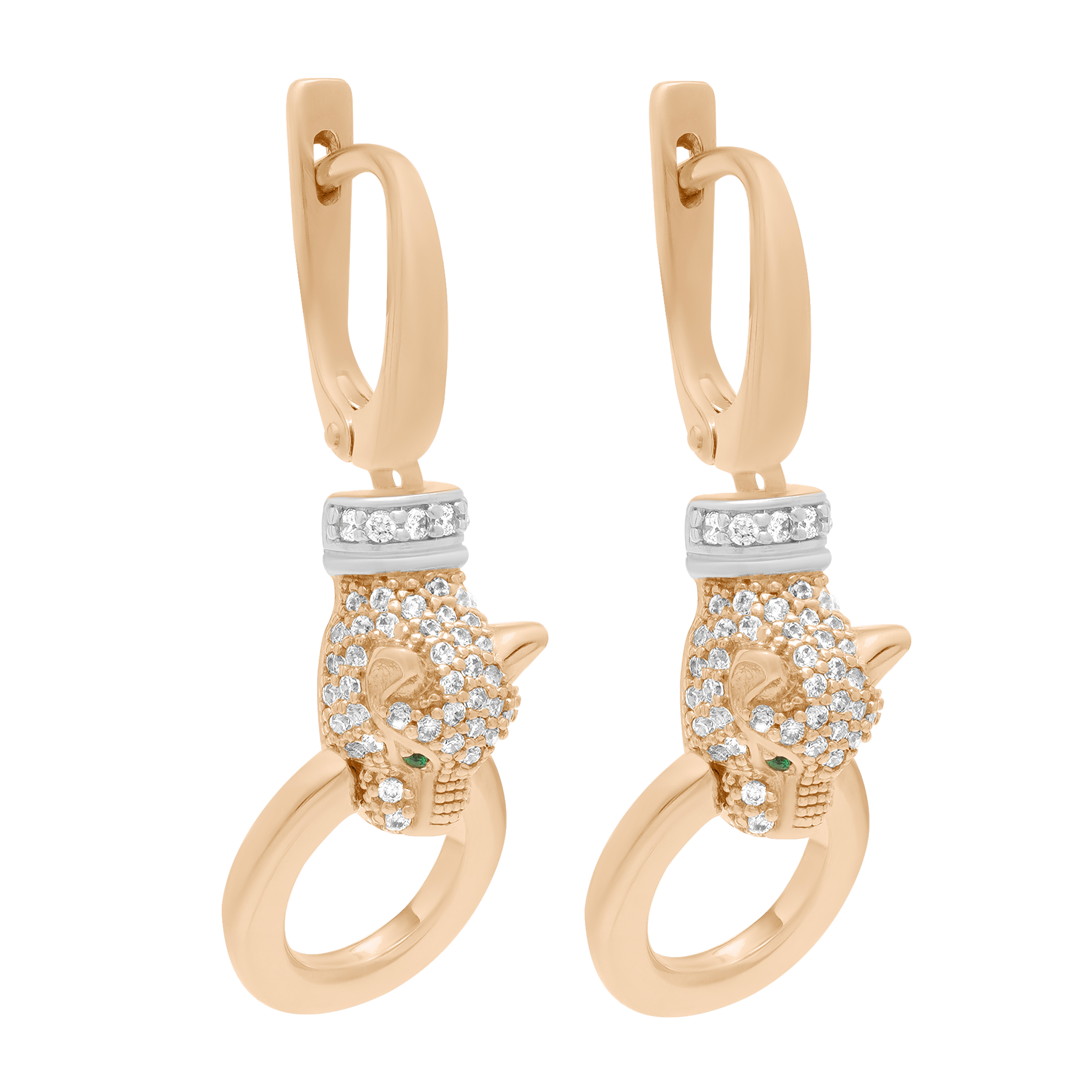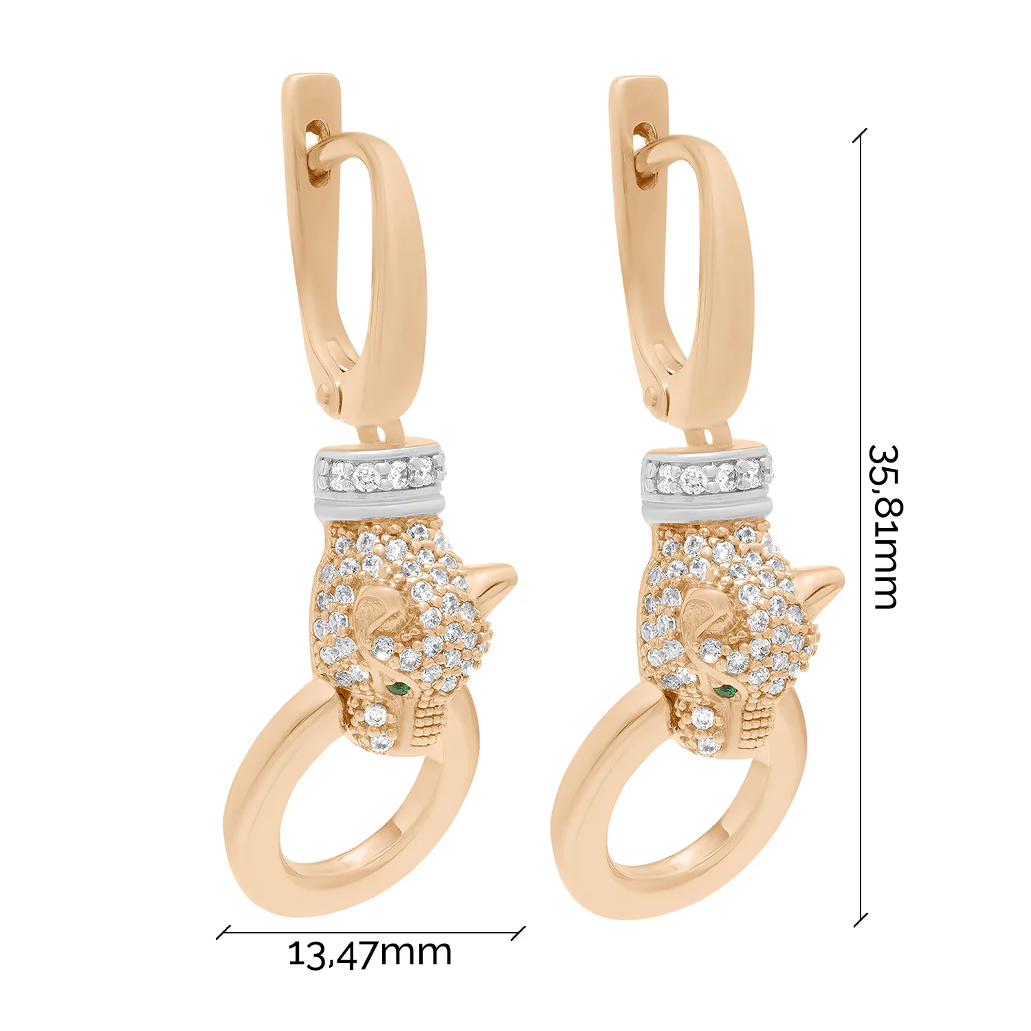 Сережки из красного золота с подвесками "Пантера" и фианитами - 1661587