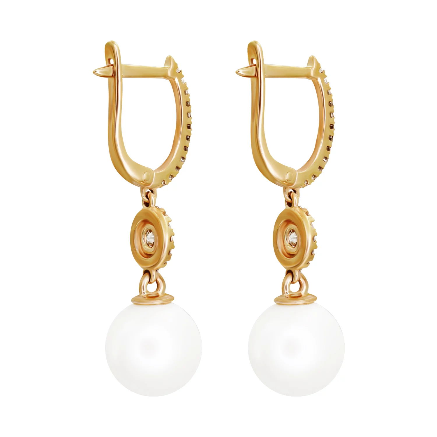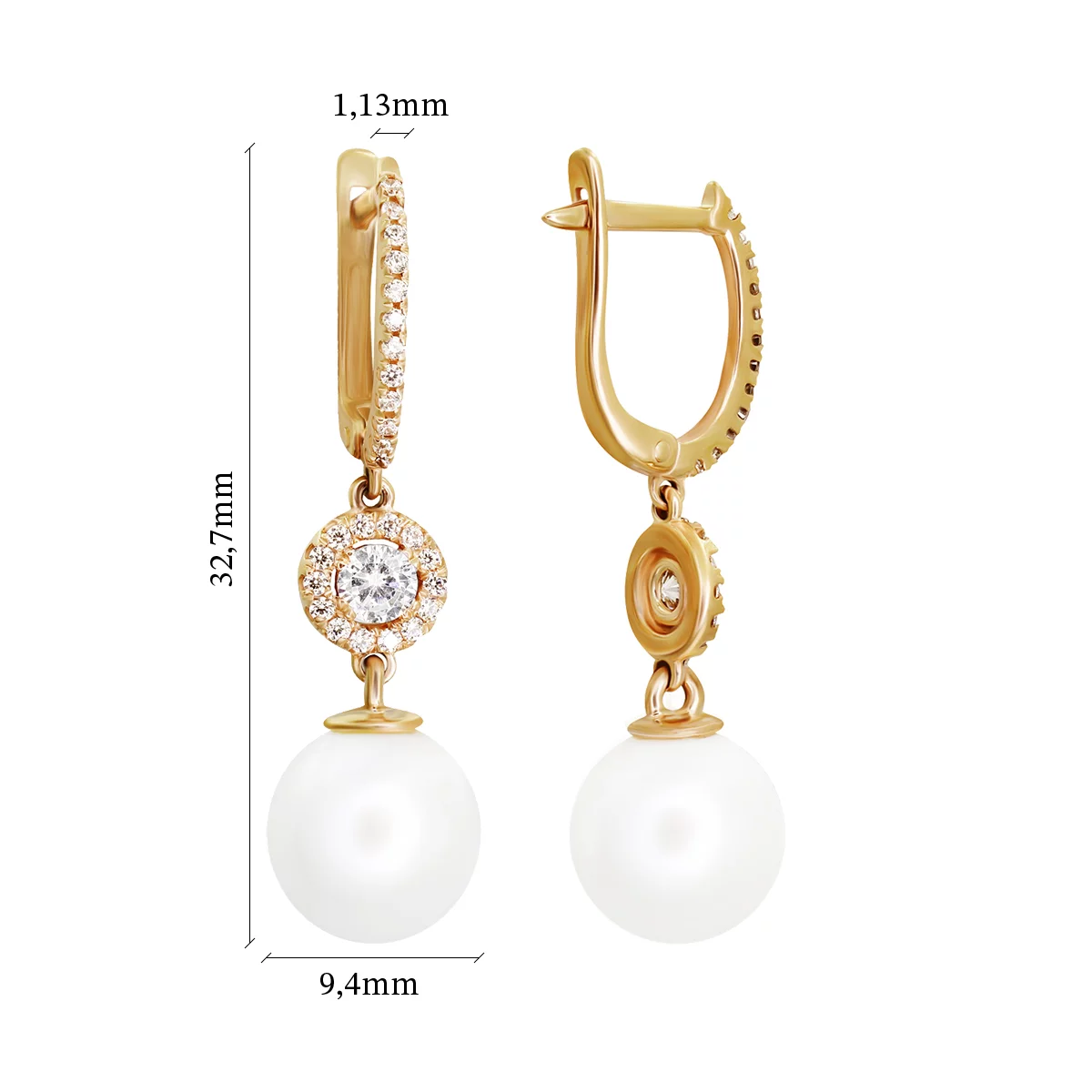 Сережки из красного золота с подвесками, фианитом и жемчугом - 902118