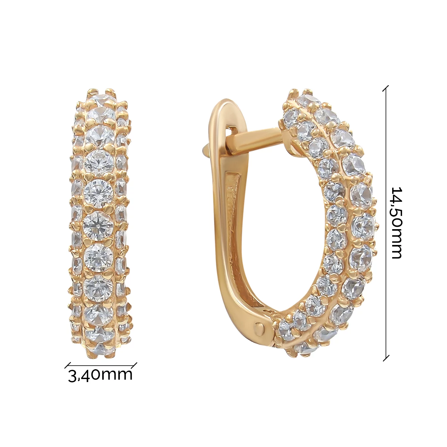 Роскошное украшение для уверенных женщин. Золотые серьги из красного золота 585 пробы обладают приятным теплым оттенком благодаря добавлению в сплав меди. Основание инкрустировано сверкающими циркониями в три ряда, которые надежно зафиксированы в цельную конструкцию. Дуэт золота и серебристых камней создает лаконичный, но в то же время изысканный дизайн. Английский замок гарантирует удобное и комфортное использование. Такие серьги подойдут как для ежедневных образов, так и для праздничного наряда. А также станут отличным подарком дорогому человеку.