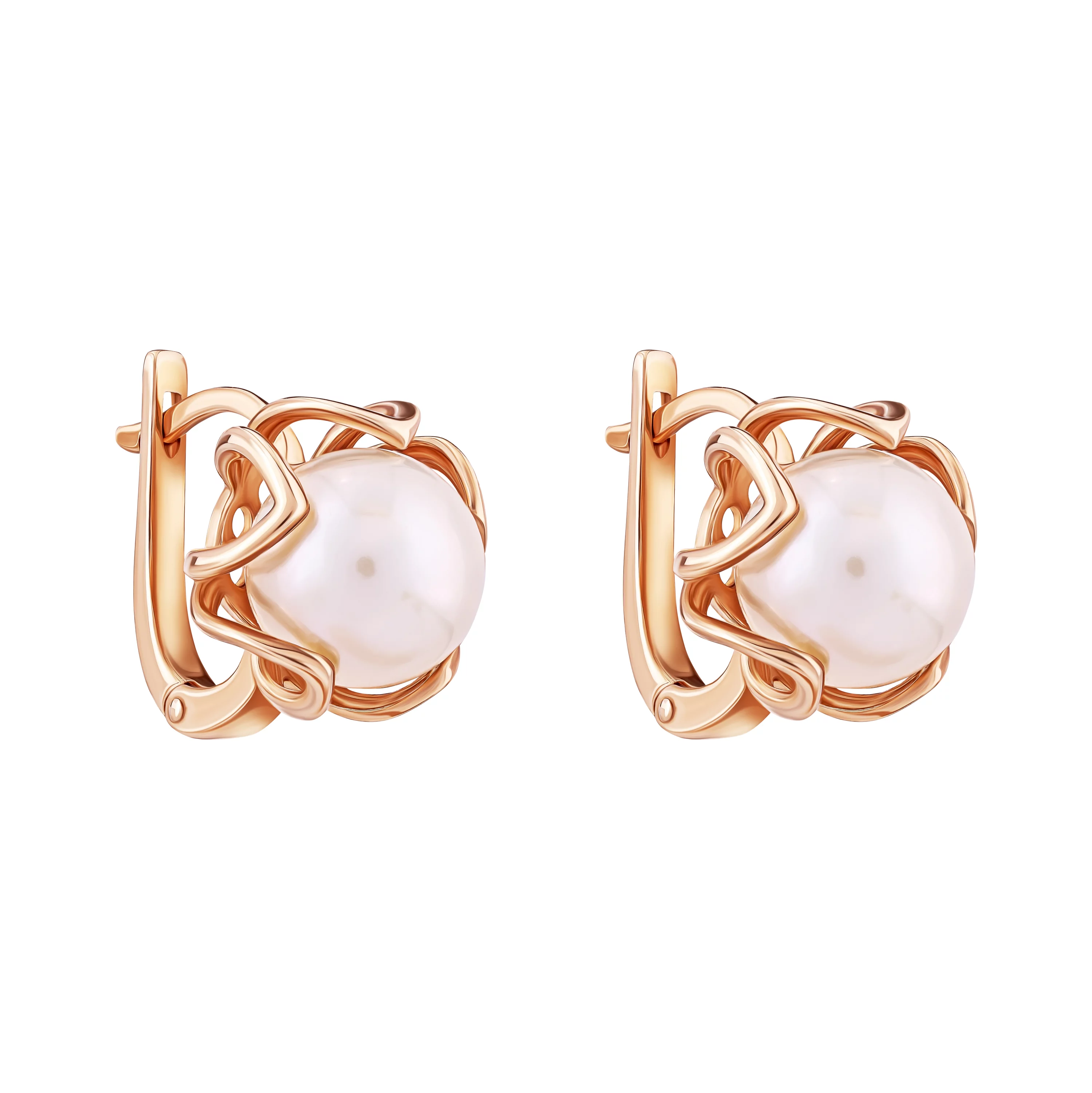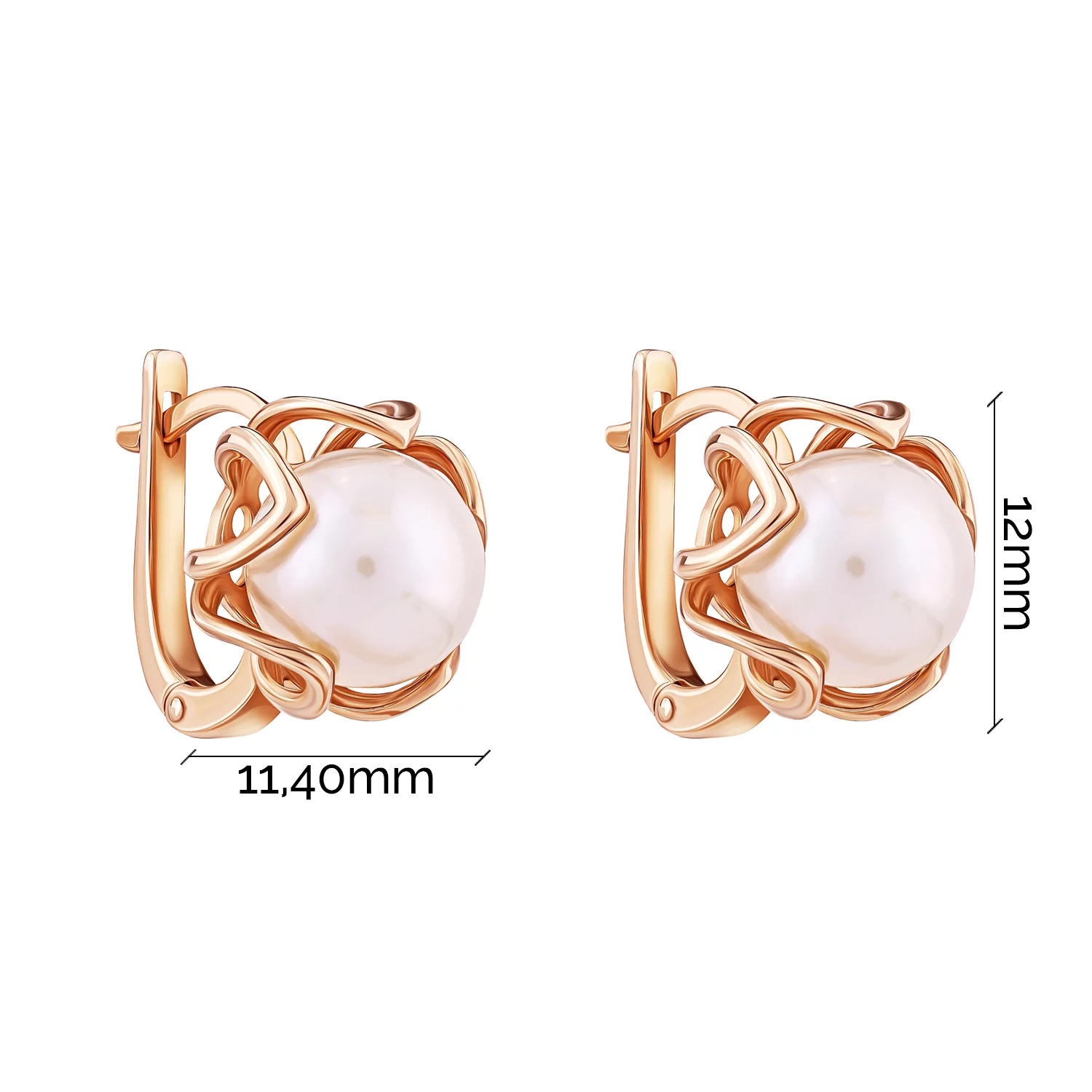 Сережки из красного золота с подвесами с фианитами и жемчужиной - 1690617