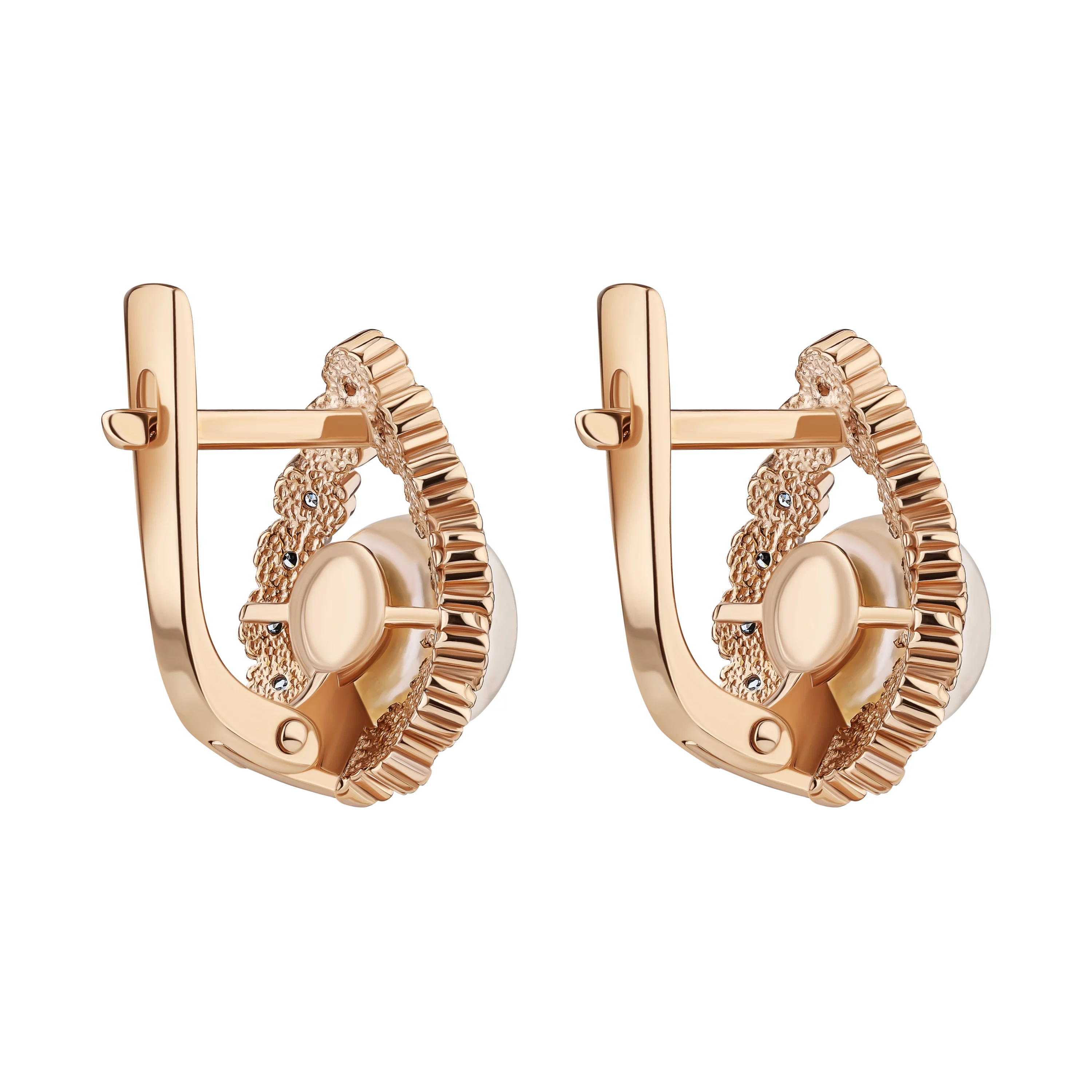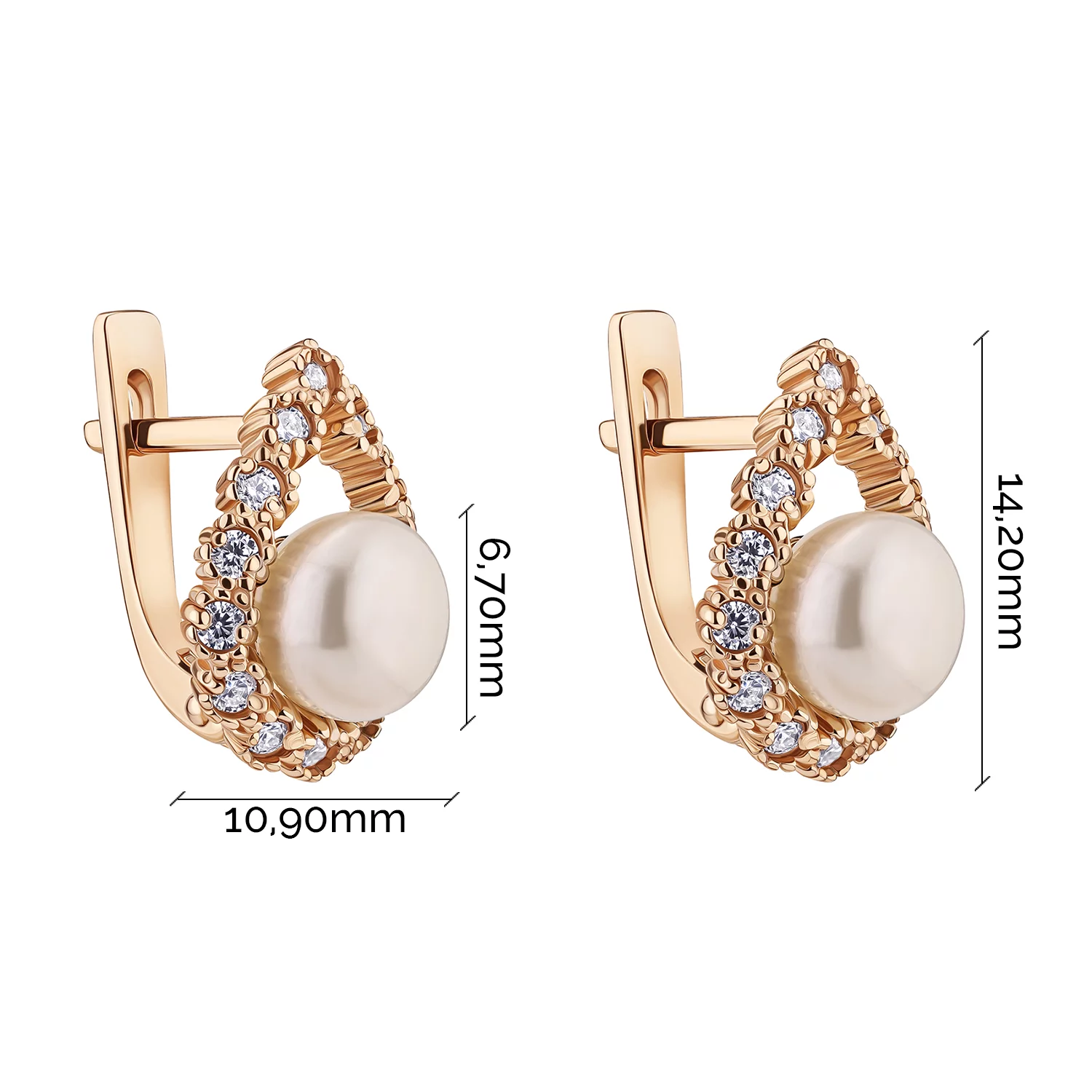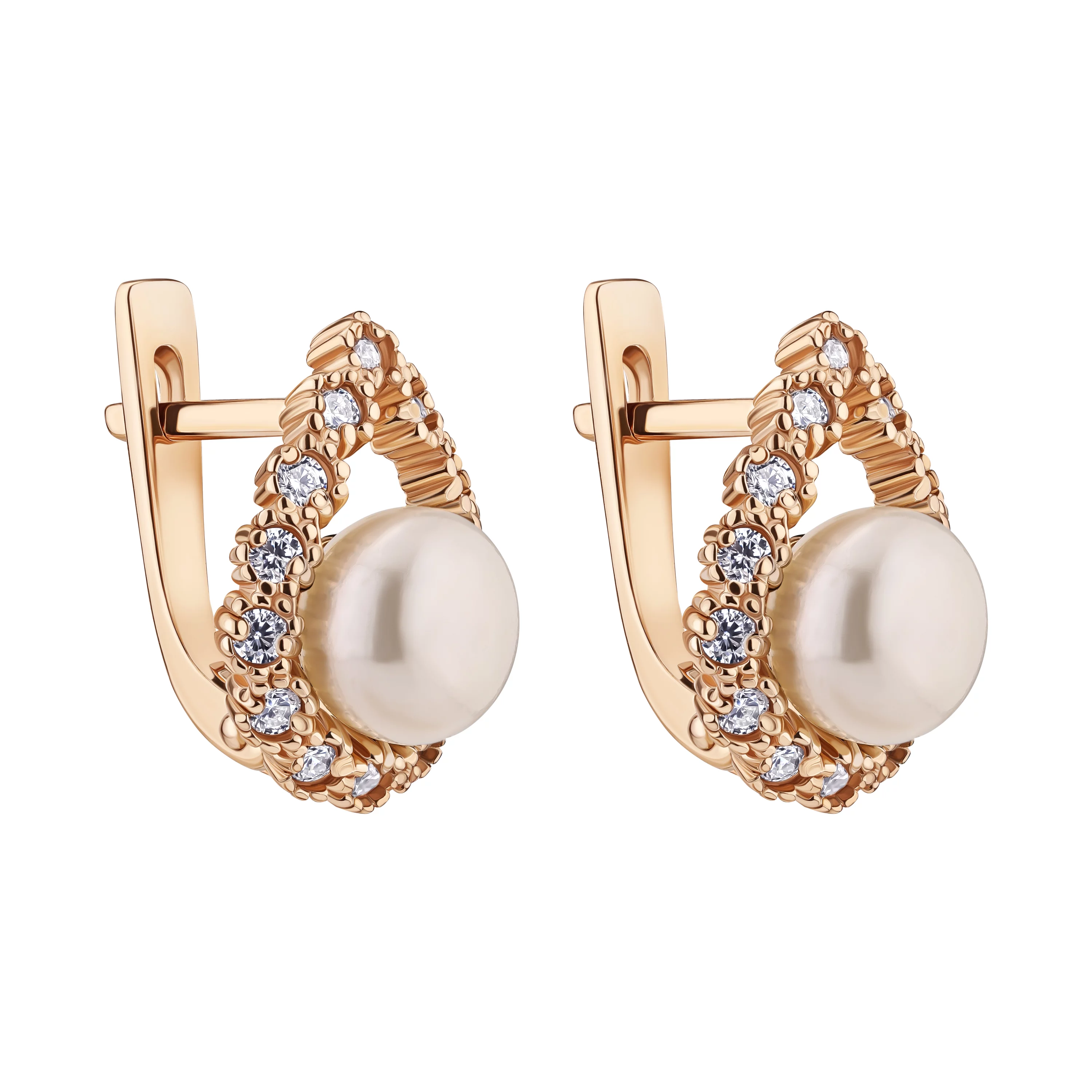 Сережки-гвоздики с жемчужиной и фианитами из красного золота - 1617638