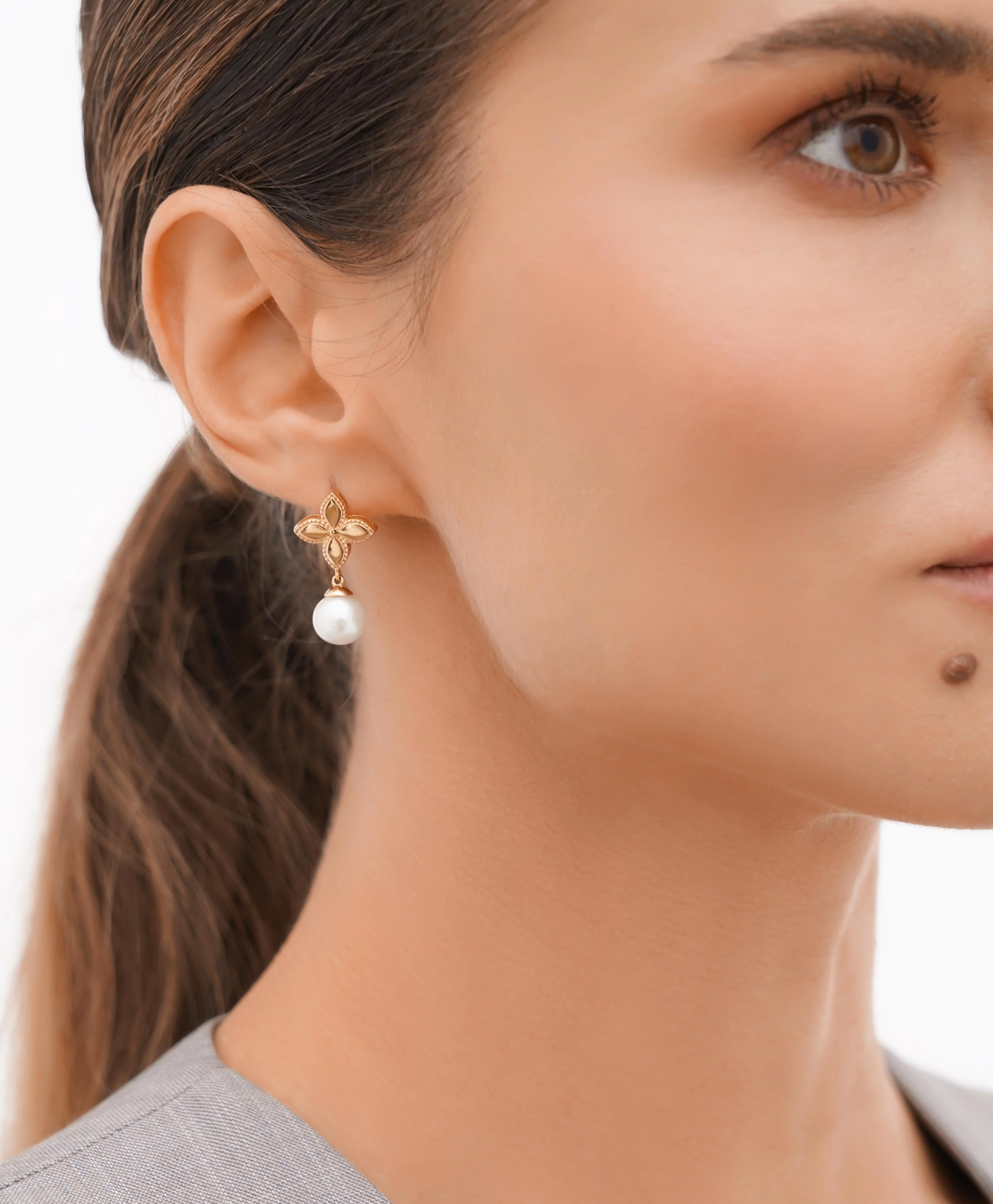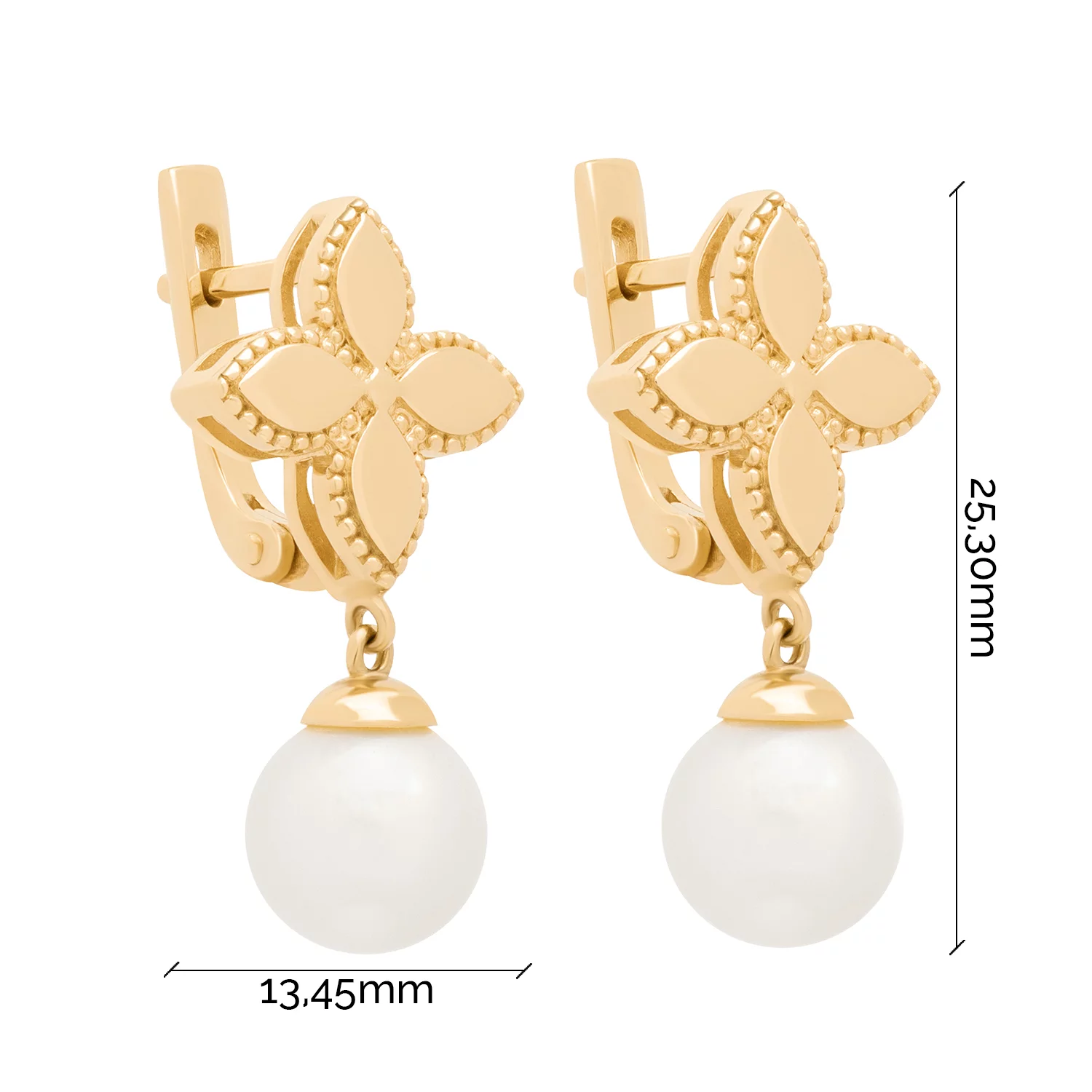Сережки в форме листочка из красного золота с жемчужиной и фианитами - 1630904