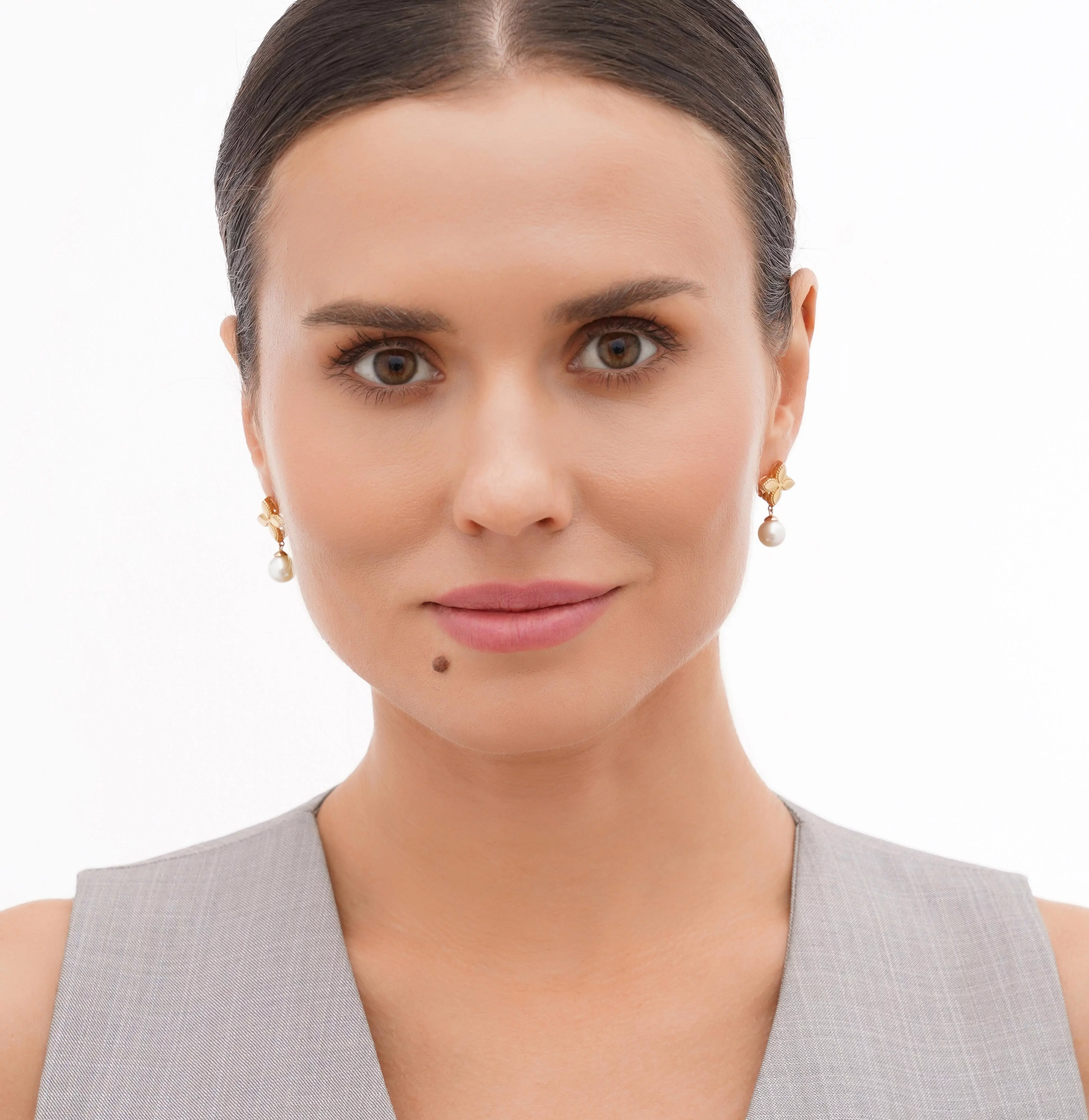 Стильные сережки-гвоздики "Флора" из красного золота с жемчугом, эмалью и фианитами - 1927148
