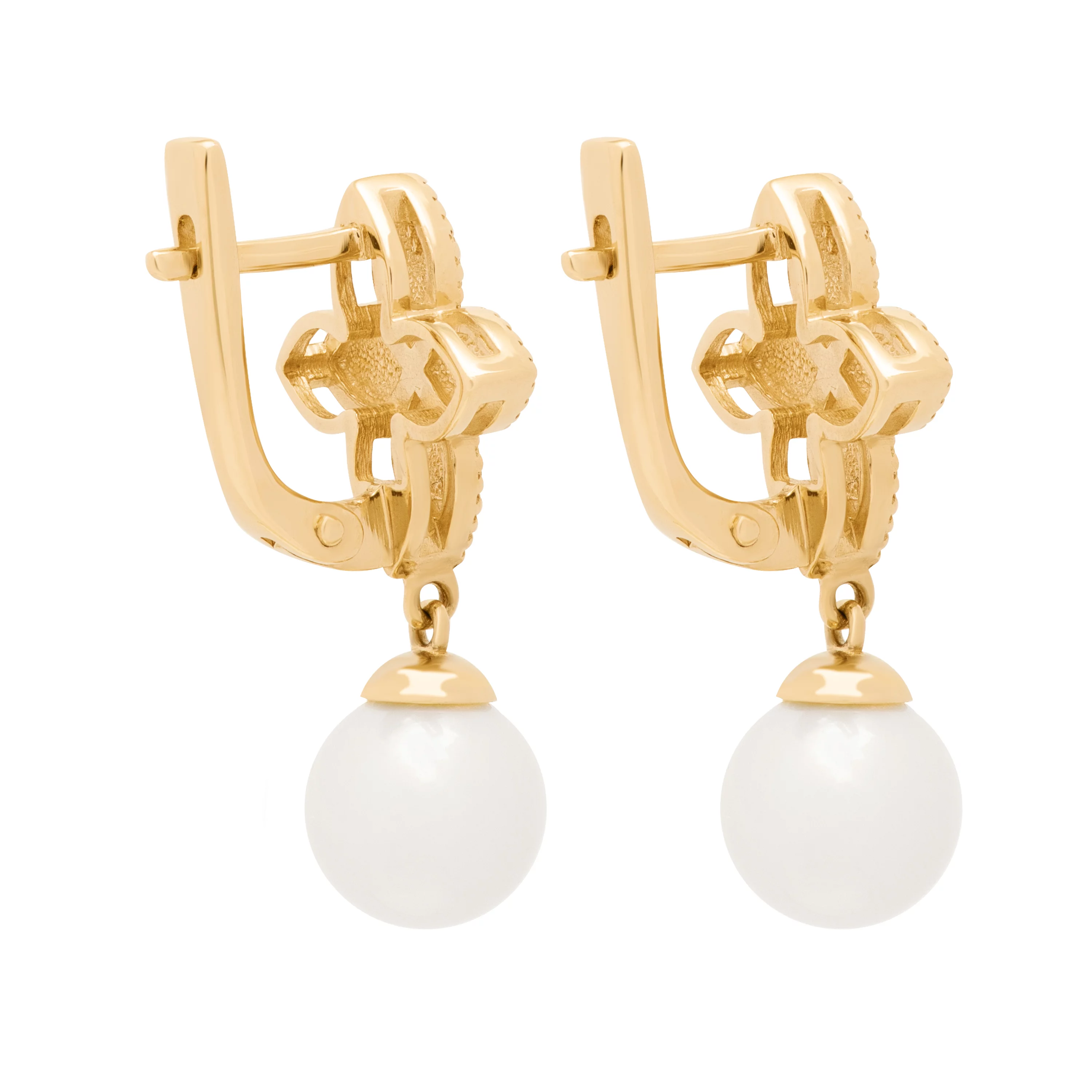 Сережки из красного золота с подвесами с фианитами и жемчужиной - 1690617