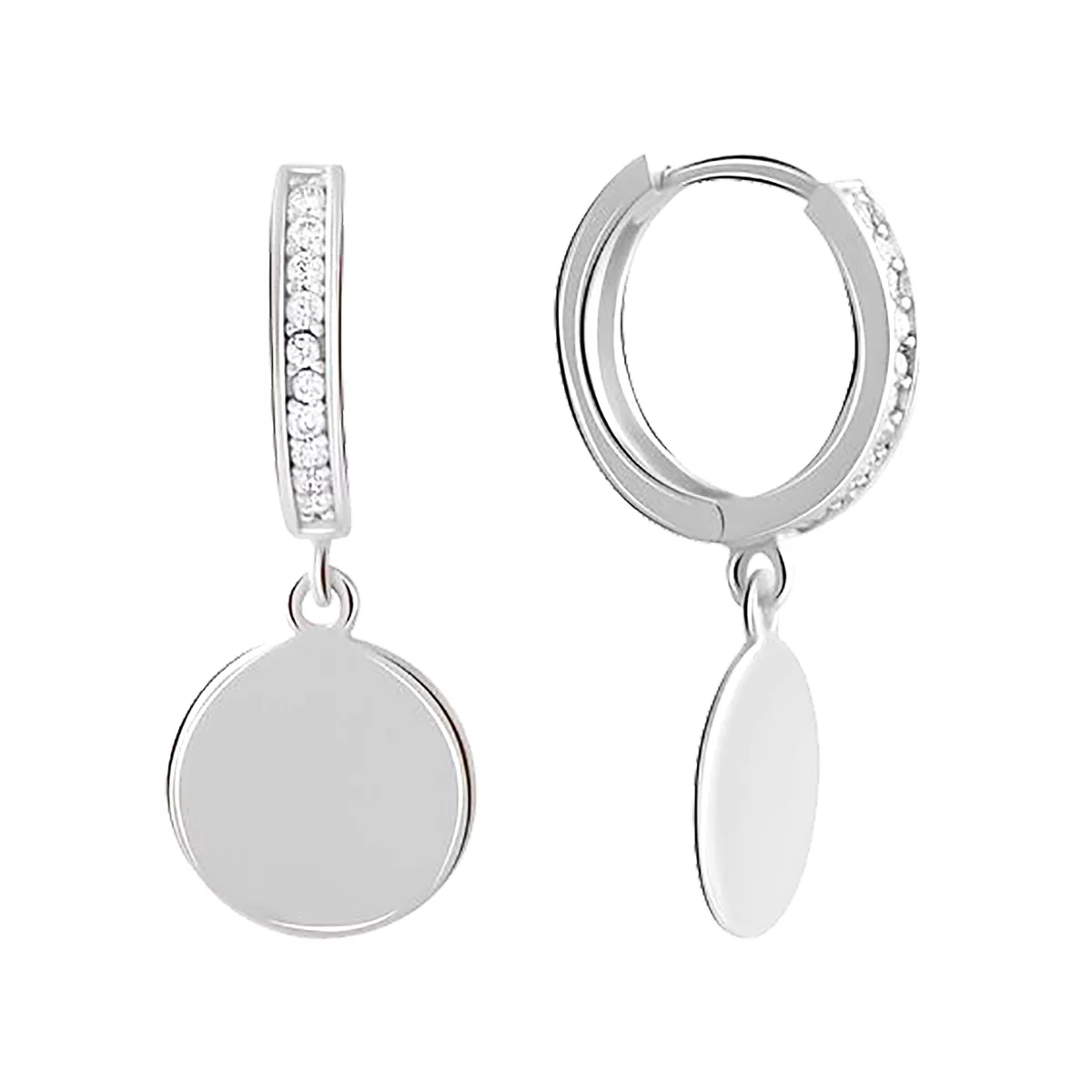 Сережки-кольца из белого золота с подвесками и фианитом Монетки - 963335